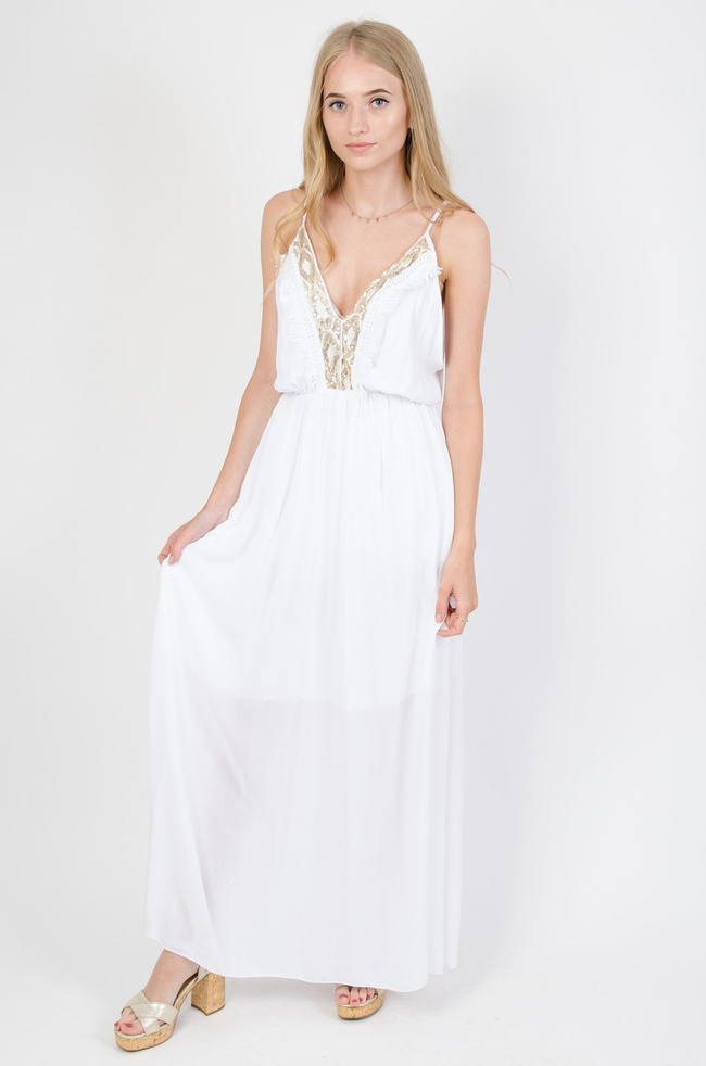 Biała długa sukienka obszyta cekinami- guma w pasie .