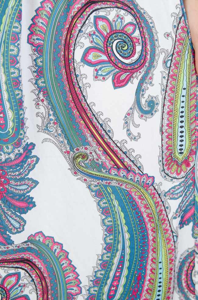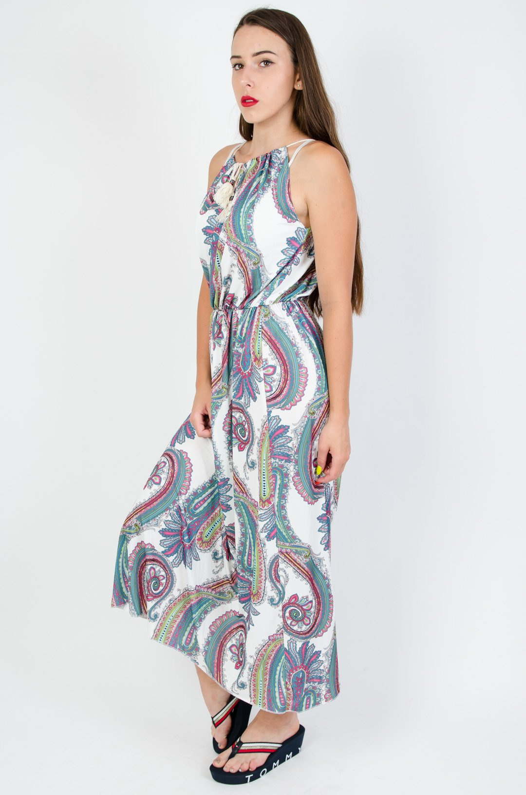 Biała długa wzorzysta sukienka wiązana w dekolcie