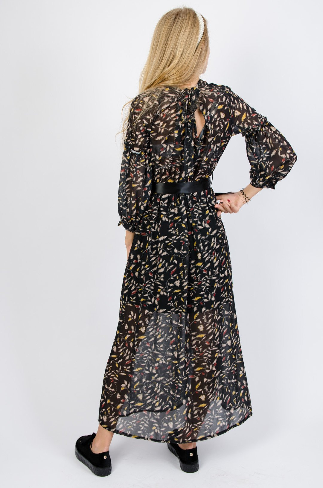 Długa czarna sukienka w kwiaty wiązana na plecach