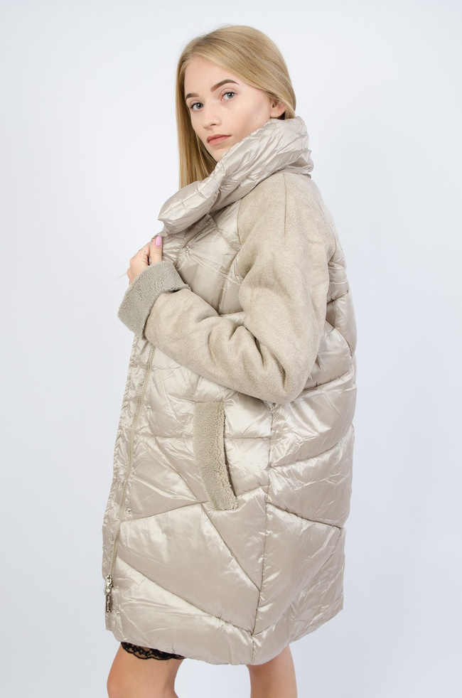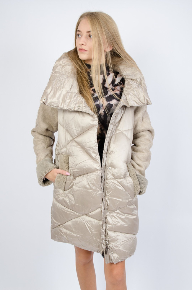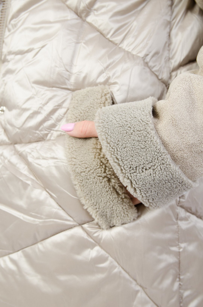 Beżowy pikowany płaszczyk z kożuchem na rękawach