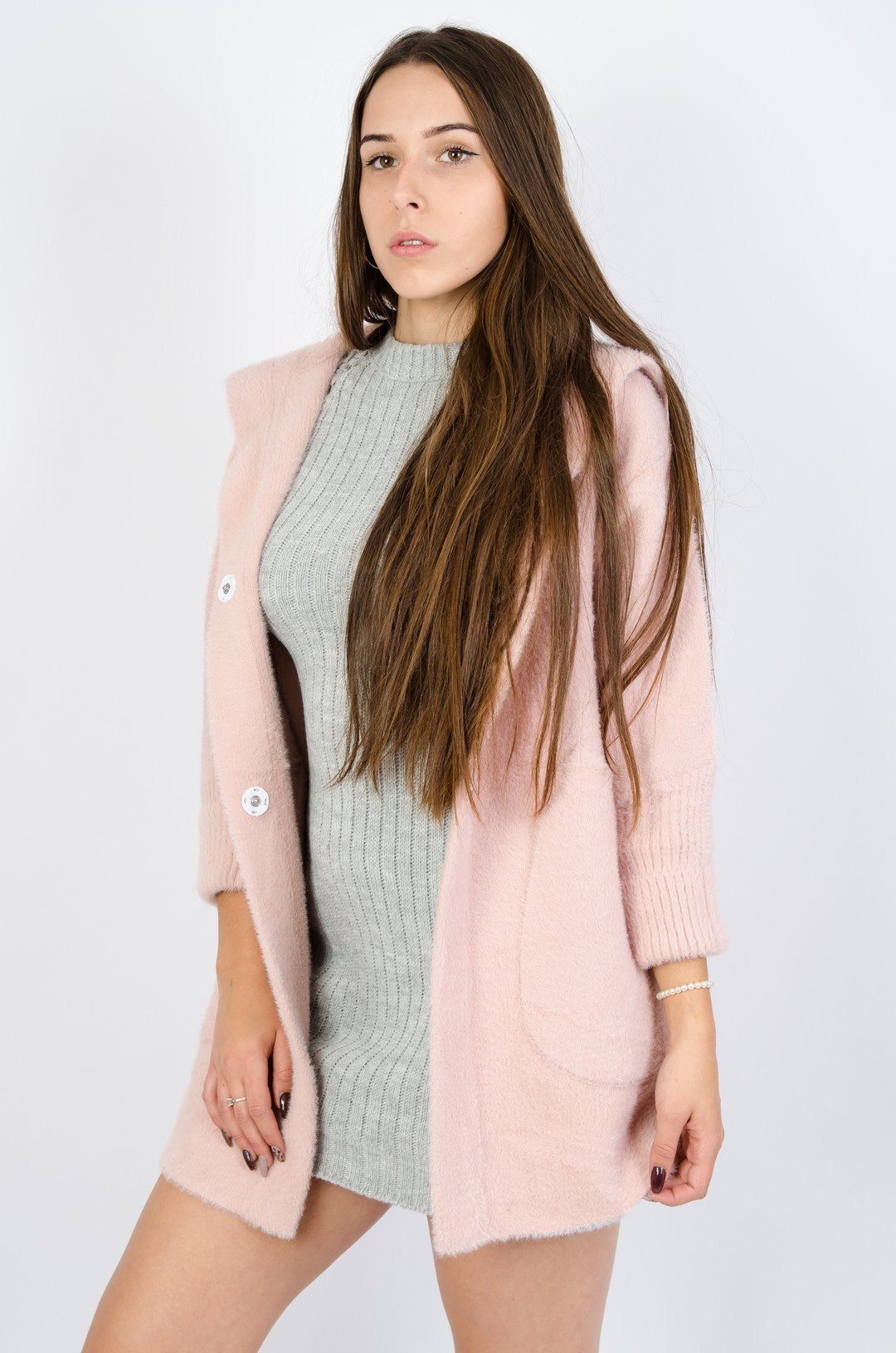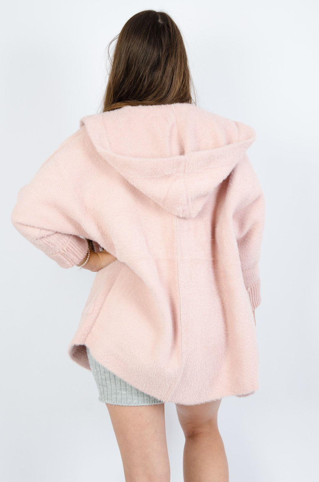 Rózowy włochaty płaszcz z kapturem
