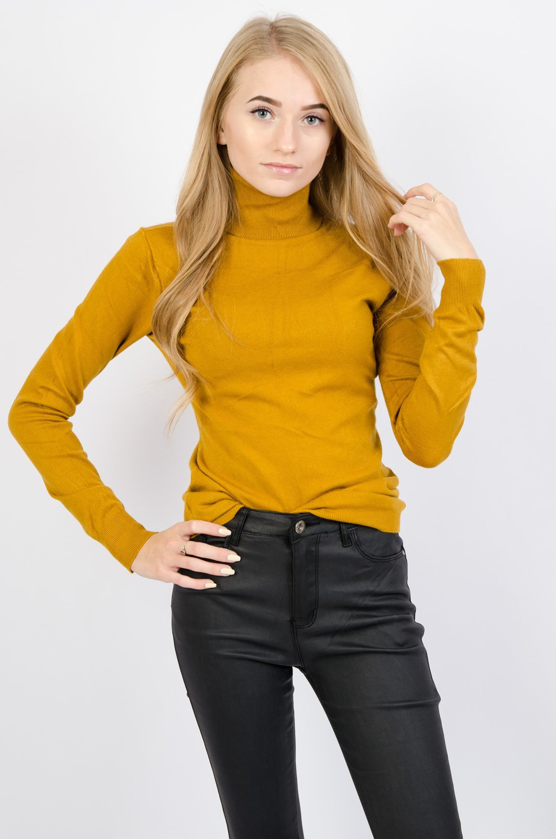 MUSZTARDOWY CIENKI SWETER Z GOLFEM