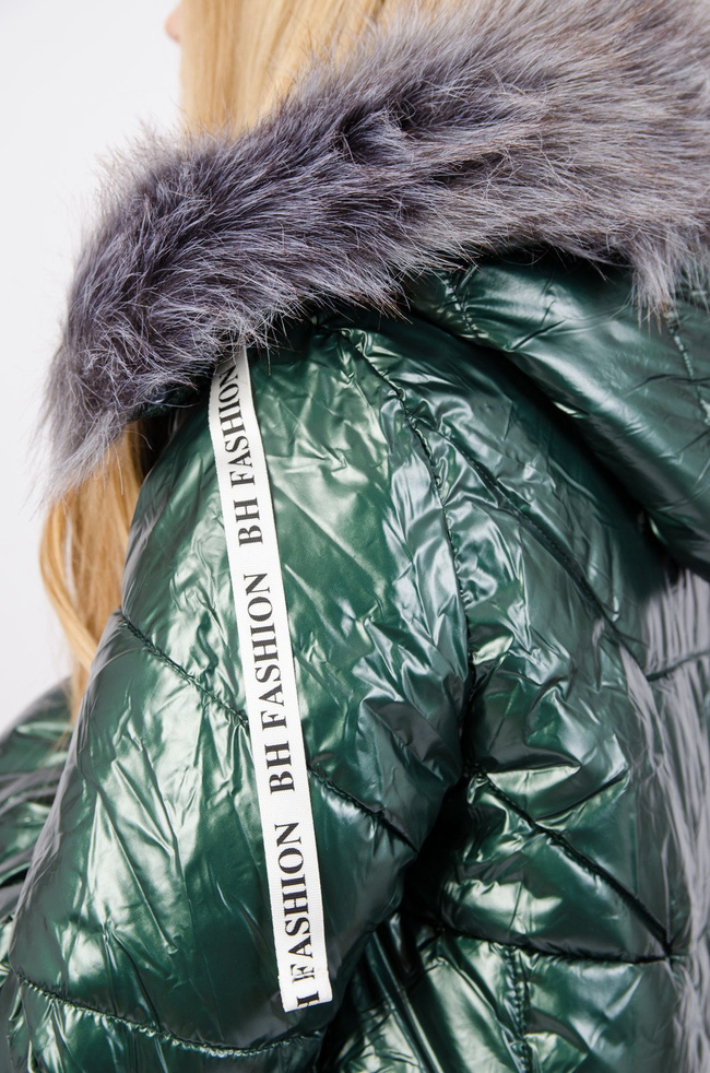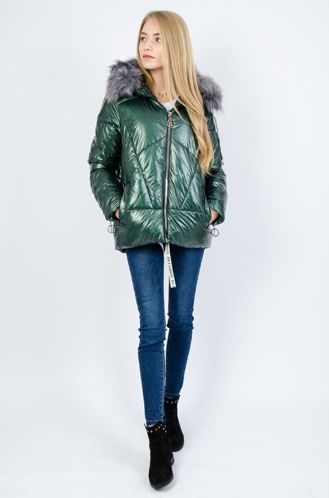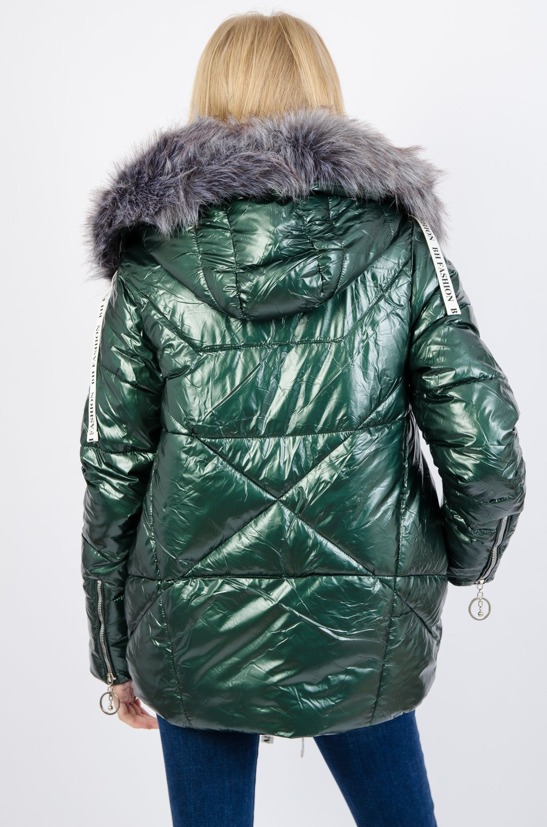 Zielona błyszcząca kurtka z futerkiem przy kapturze.