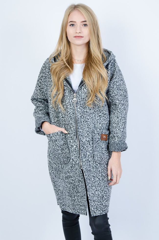 Szary jesienny płaszcz z kapturem oraz naszywką na kieszeni