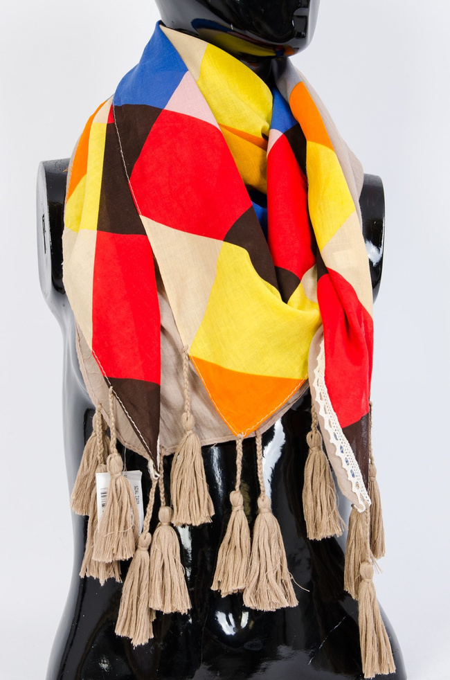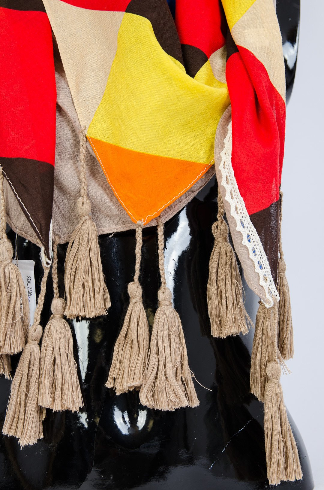 Beżowy szal w kolorowe prostokąty z frędzlami