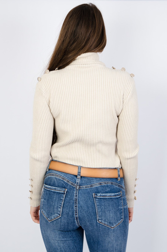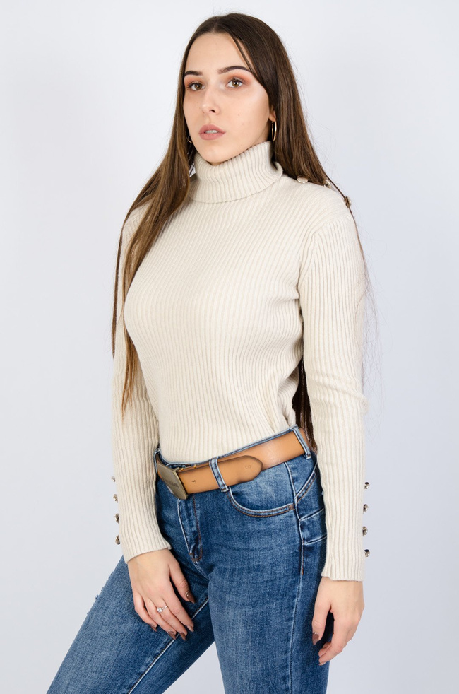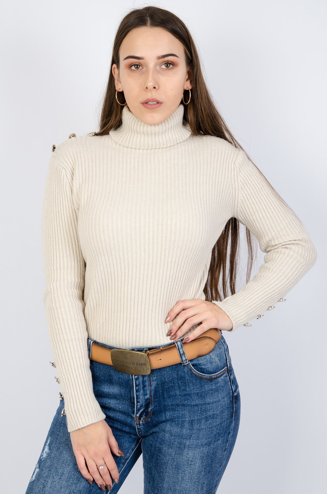 BEŻOWY PRĄŻKOWANY SWETER Z GOLFEM
