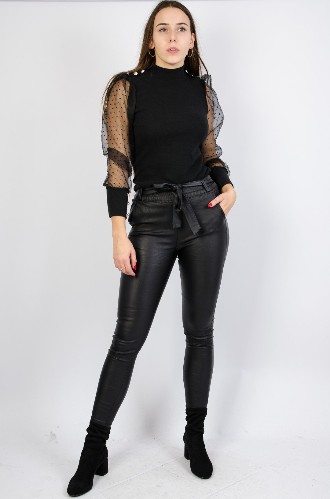 CZARNE WOSKOWANE SPODNIE Z WIĄZANIEM W PASIE - WYSOKI STAN