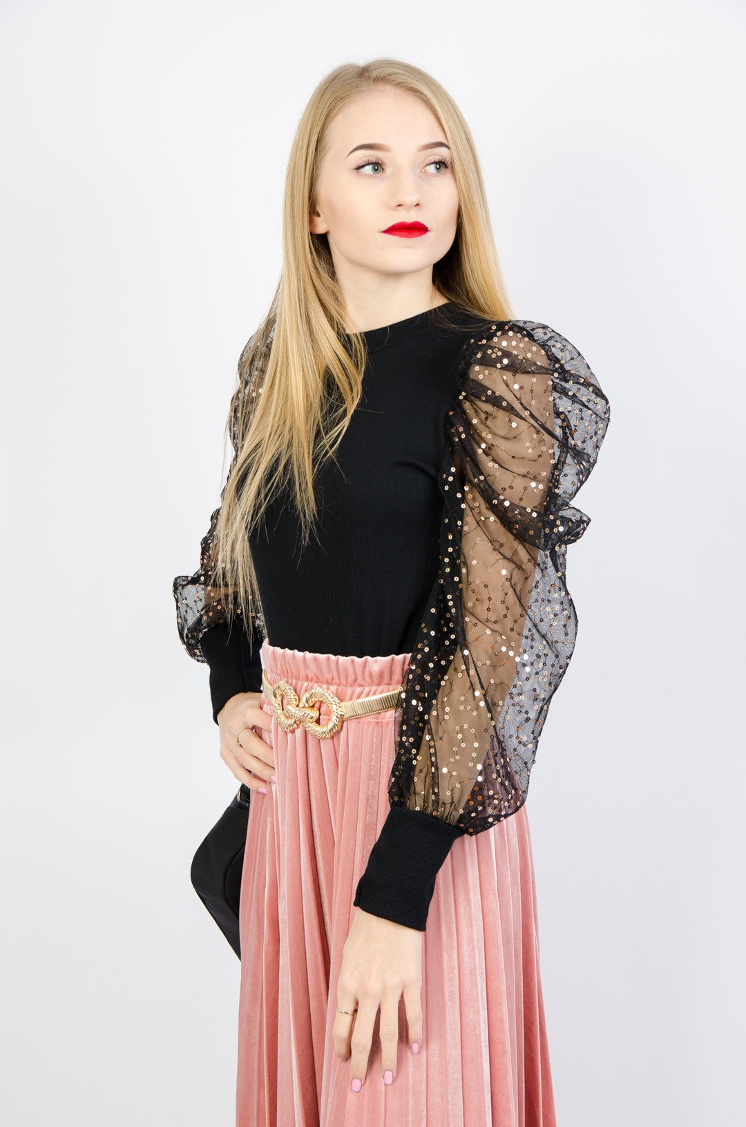 Czarna bluzka z bufkami oraz złotymi cekinami