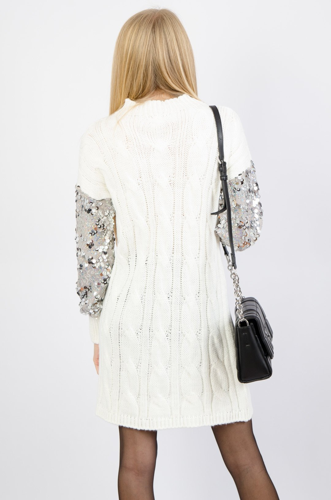 BIAŁA SWETERKOWA SUKIENKA Z CEKINOWYMI RĘKAWAMI