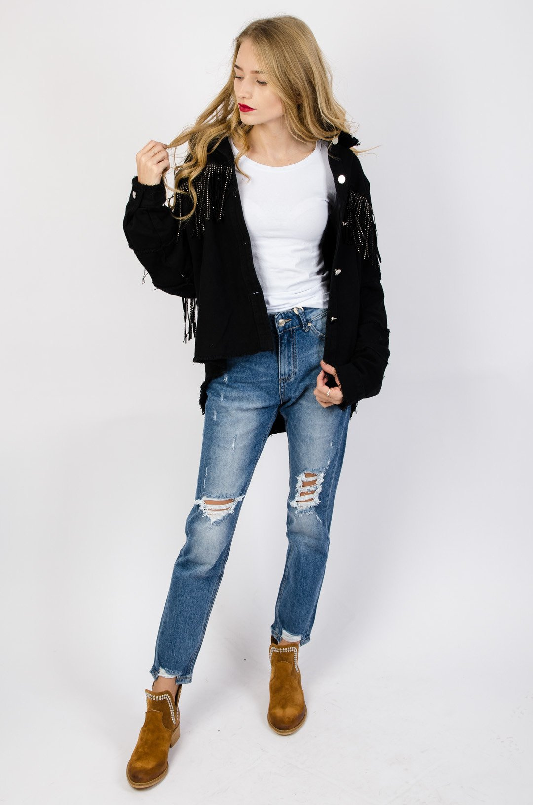CZARNA KOSZULA JEANSOWA Z OZDOBNYMI FRĘDZLAMI
