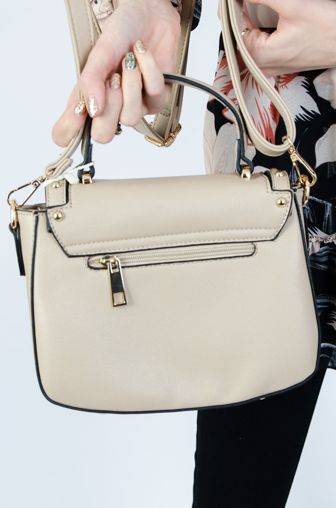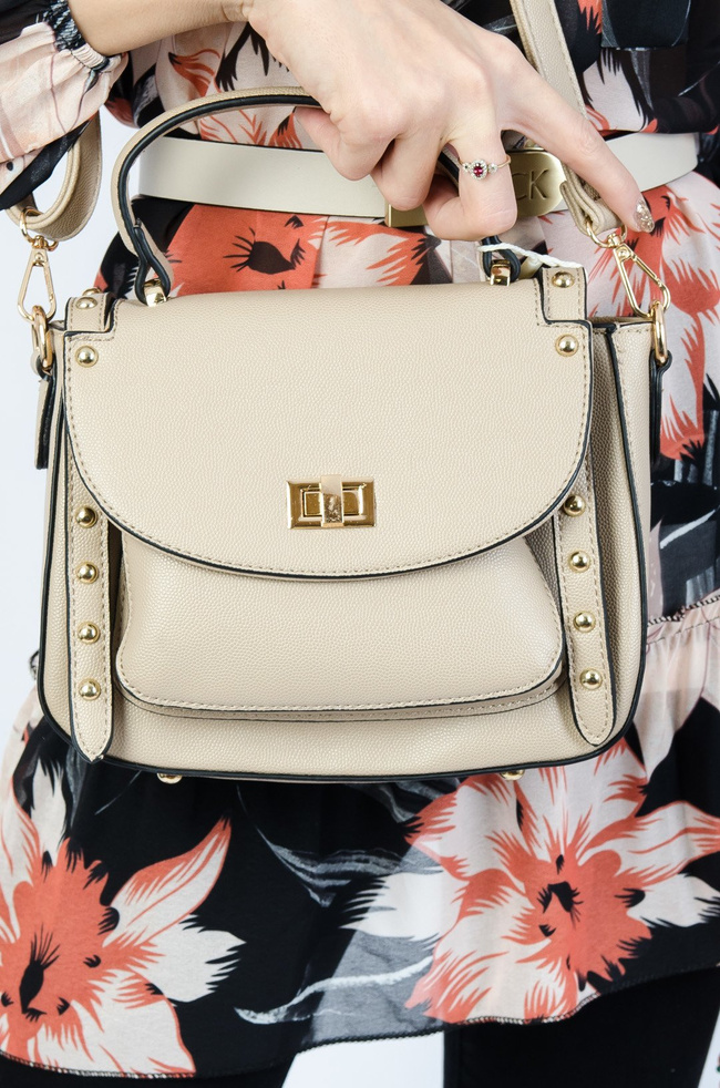 Beżowa torebka typu kuferek ze złotymi dżetami