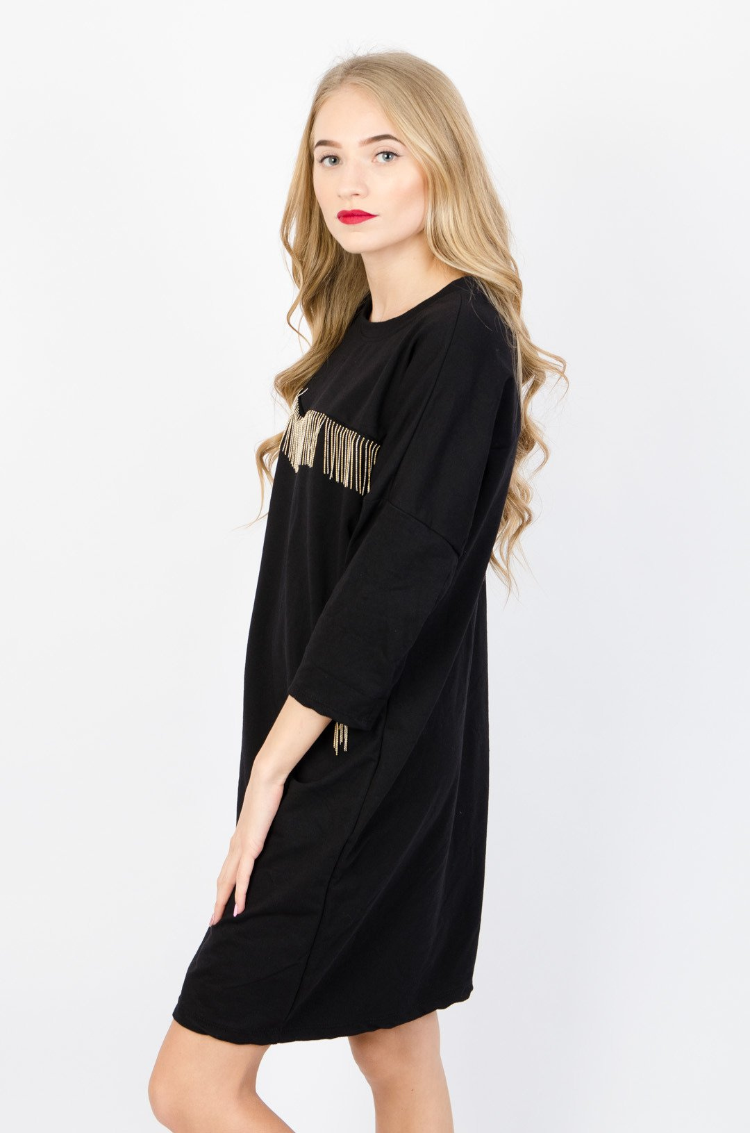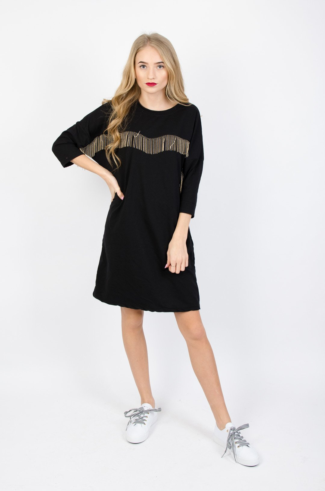 CZARNA DZIANINOWA SUKIENKA Z FRĘDZLAMI