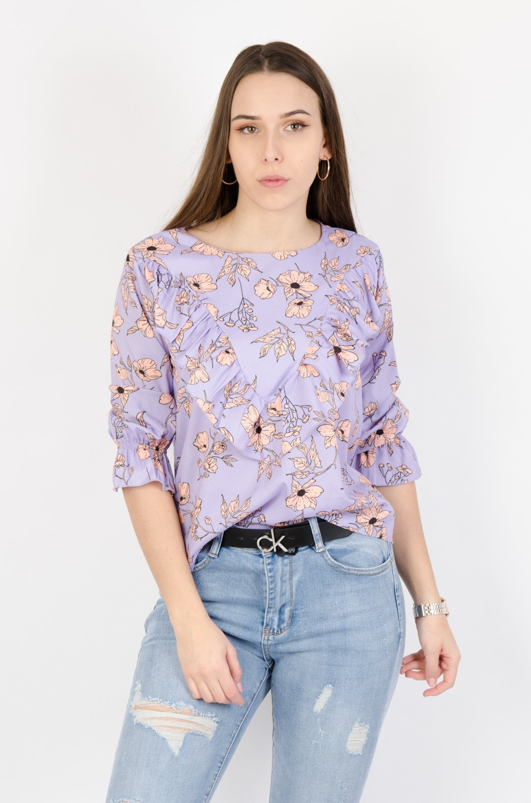 Fioletowa bluzka w pomarańczowe kwiaty z falbaną