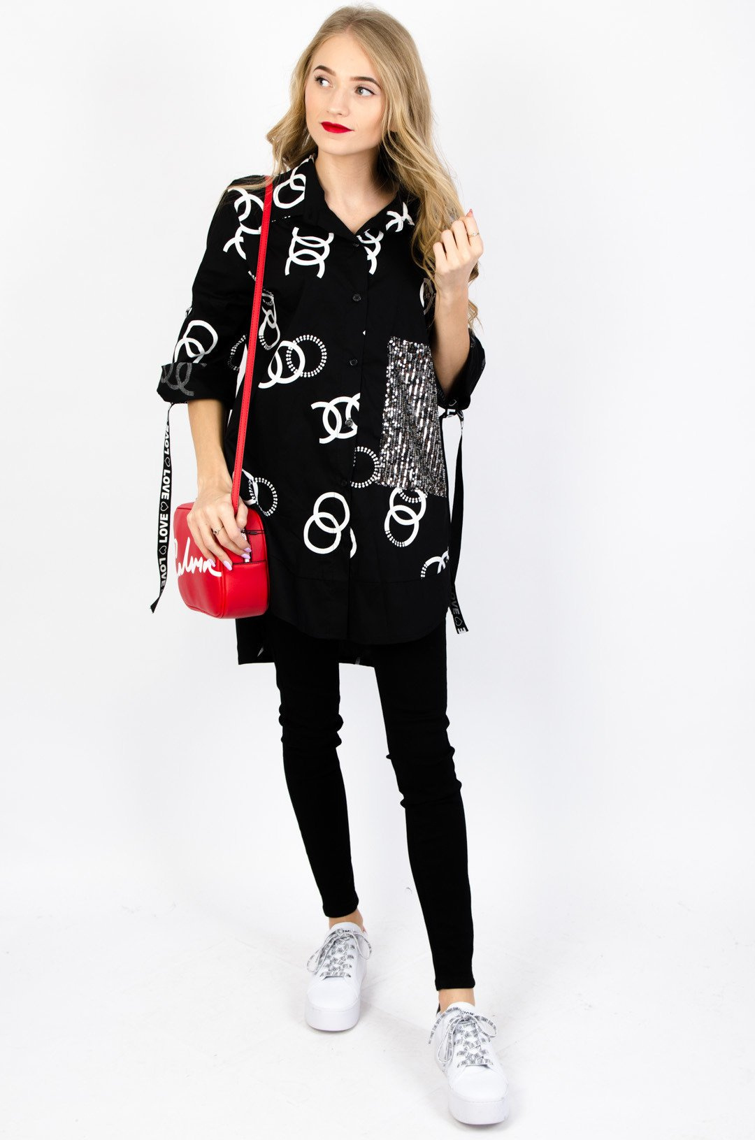 Czarna koszula z wzorem cc oraz cekinową kieszenią