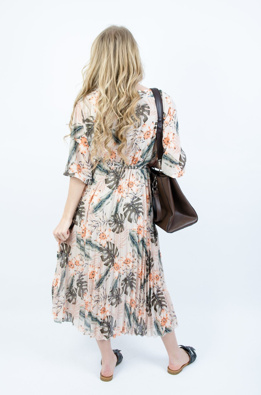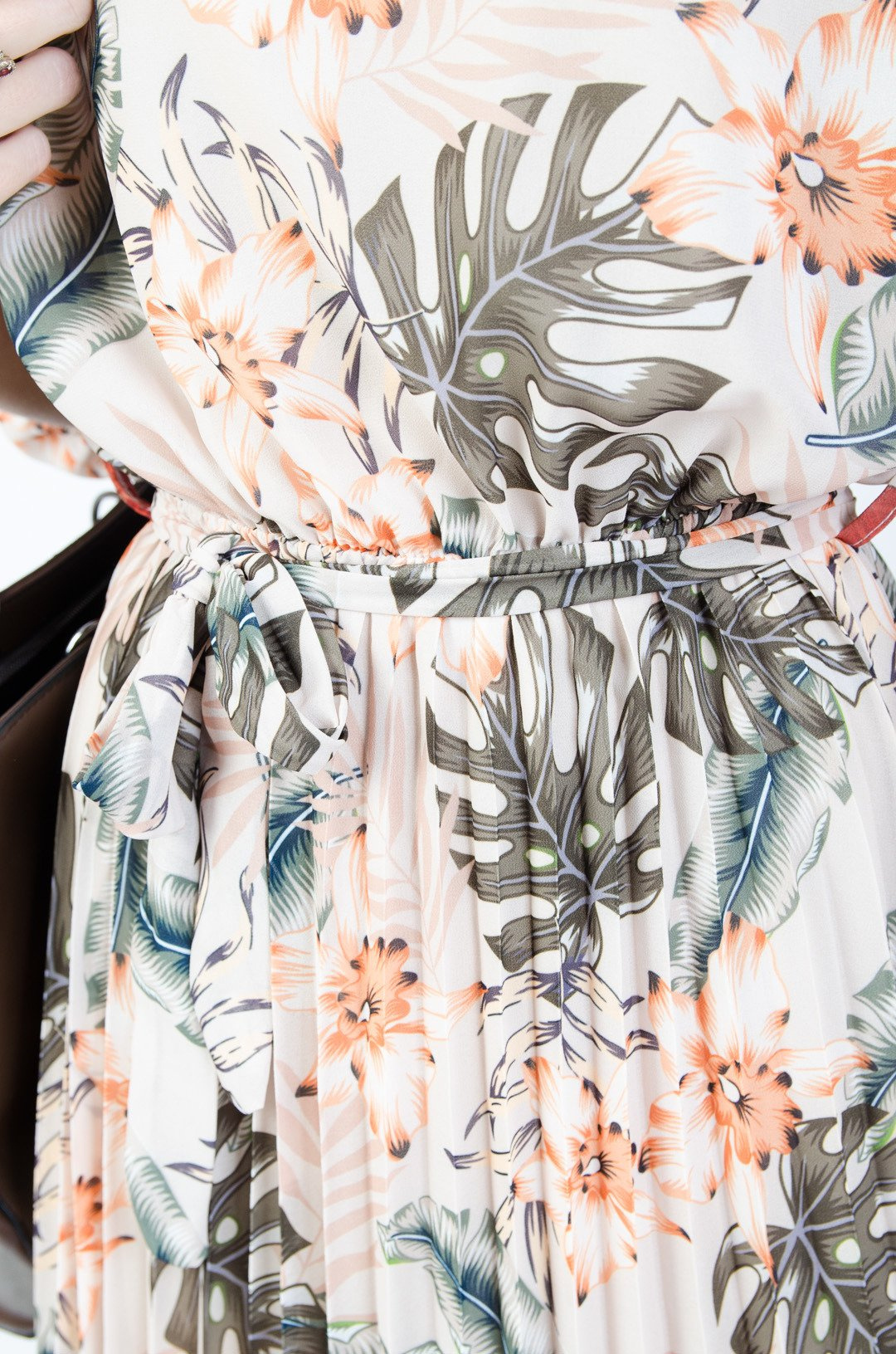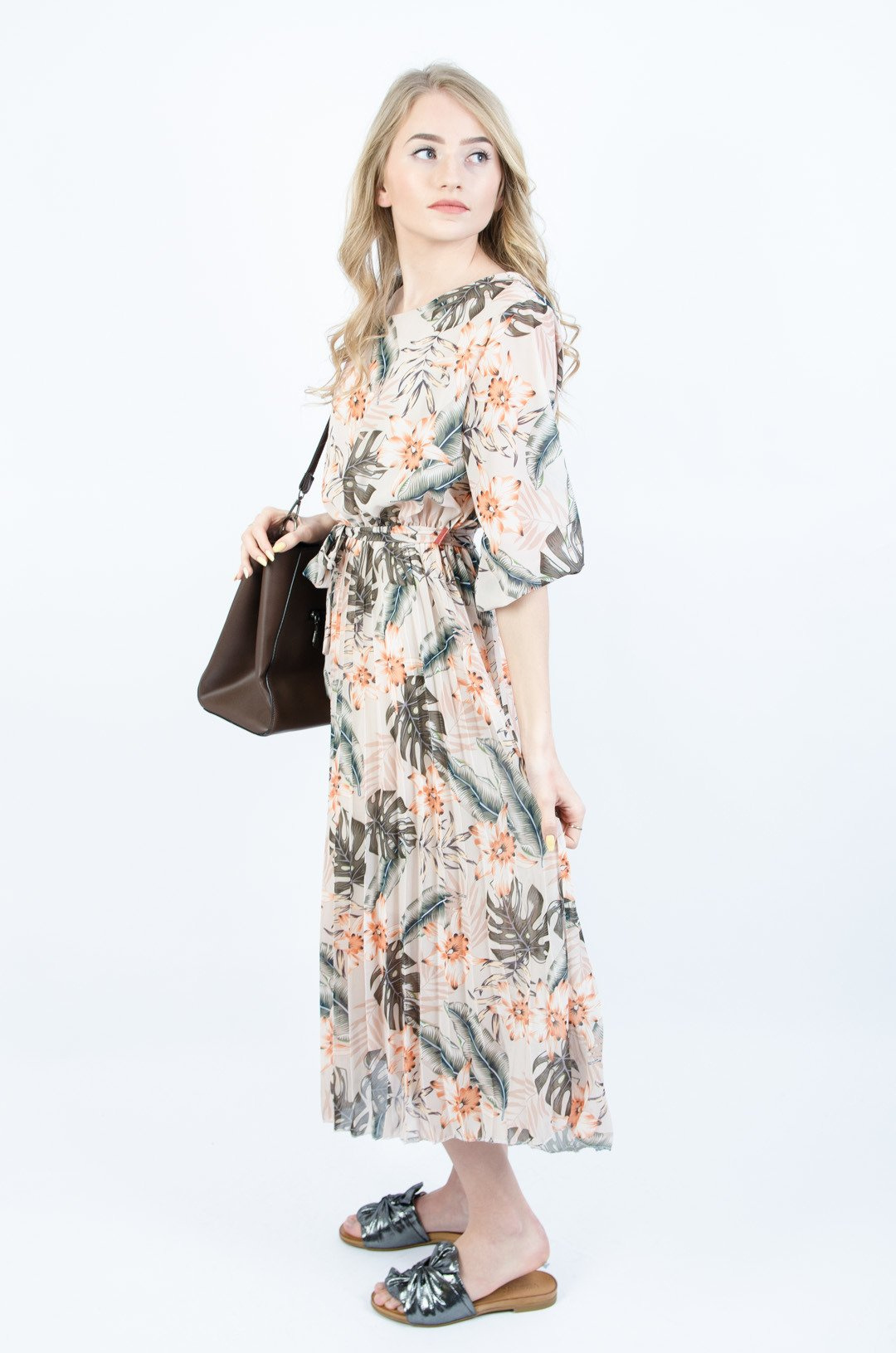 BEŻOWA SUKIENKA W KWIATY Z PLISOWANYM DOŁEM