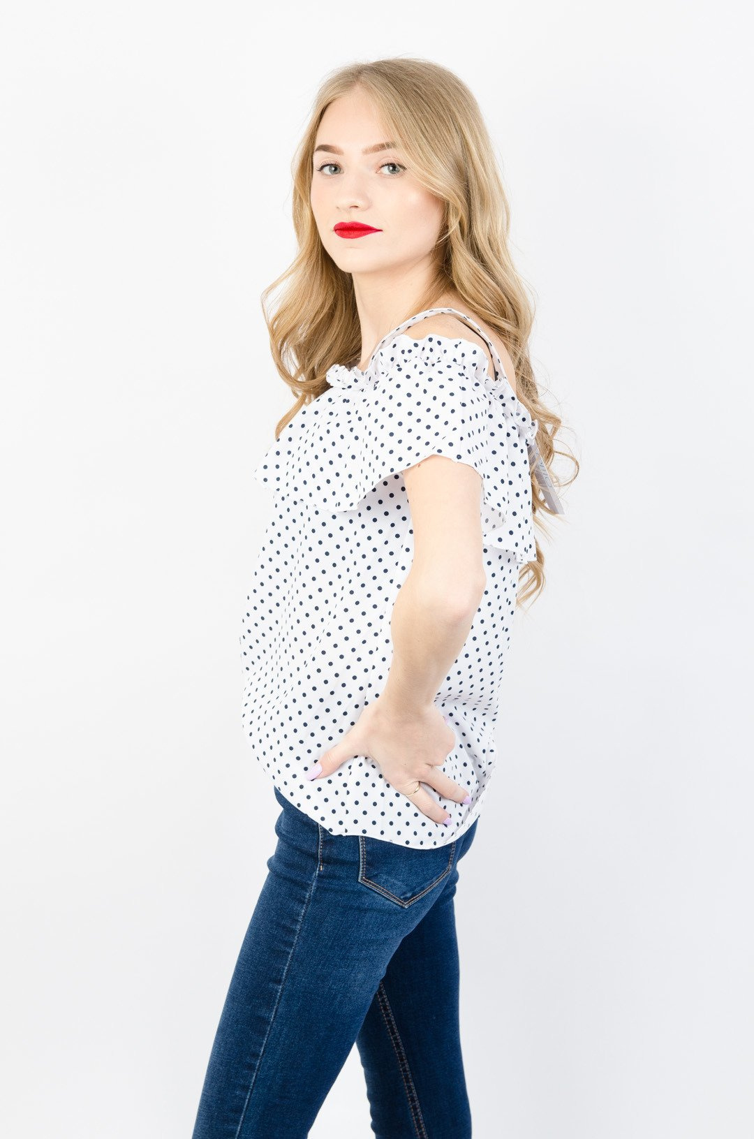 Biała bluzka w groszki z hiszpańskim dekoltem