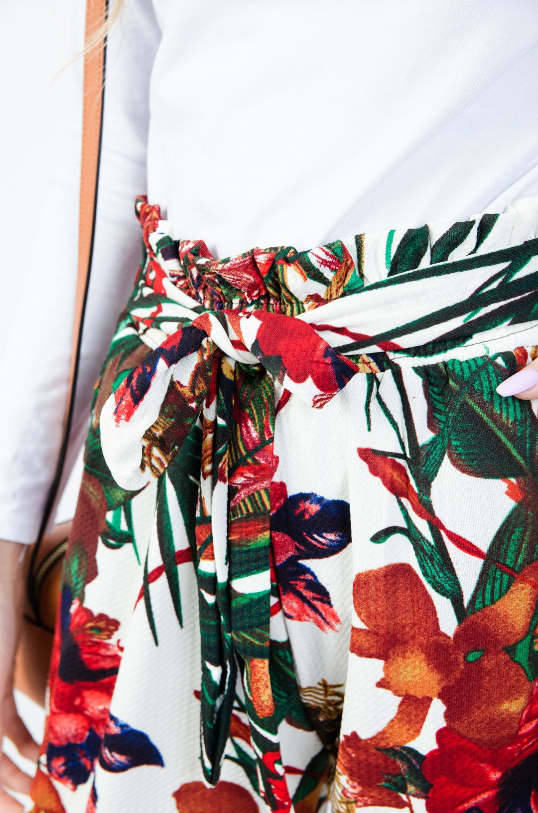 Białe alladynki w kwiaty z wiązaniem w pasie