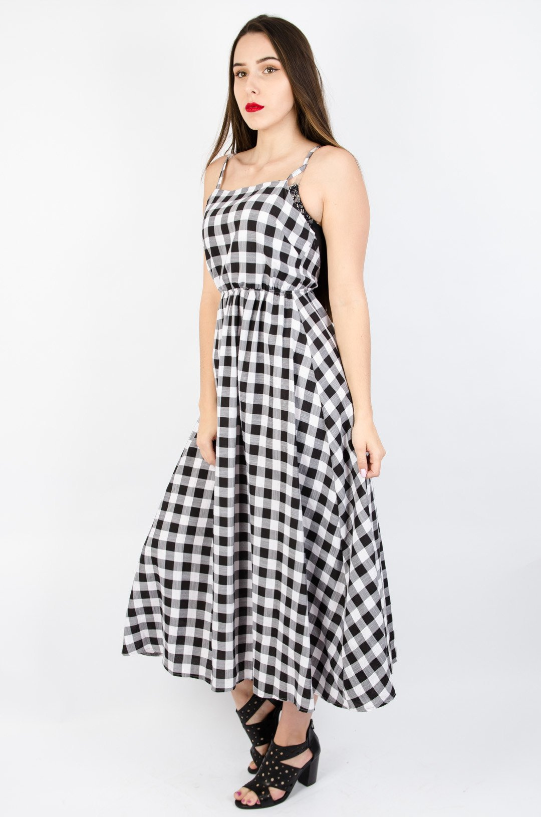 Długa sukienka w kratę na ramiączkach