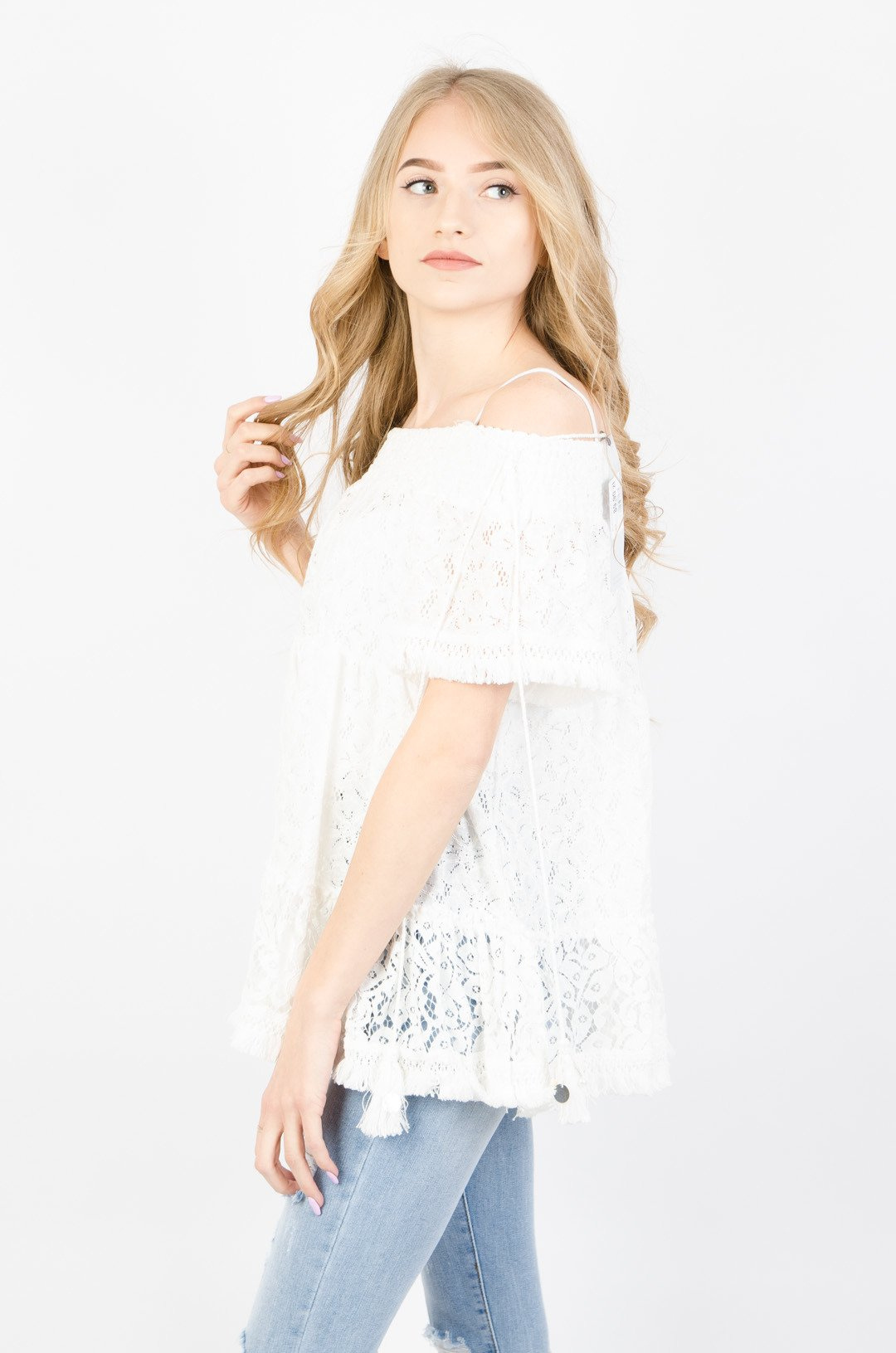 Biała koronkowa bluzka z gumą w dekolcie oraz ramiączkami ze sznurka