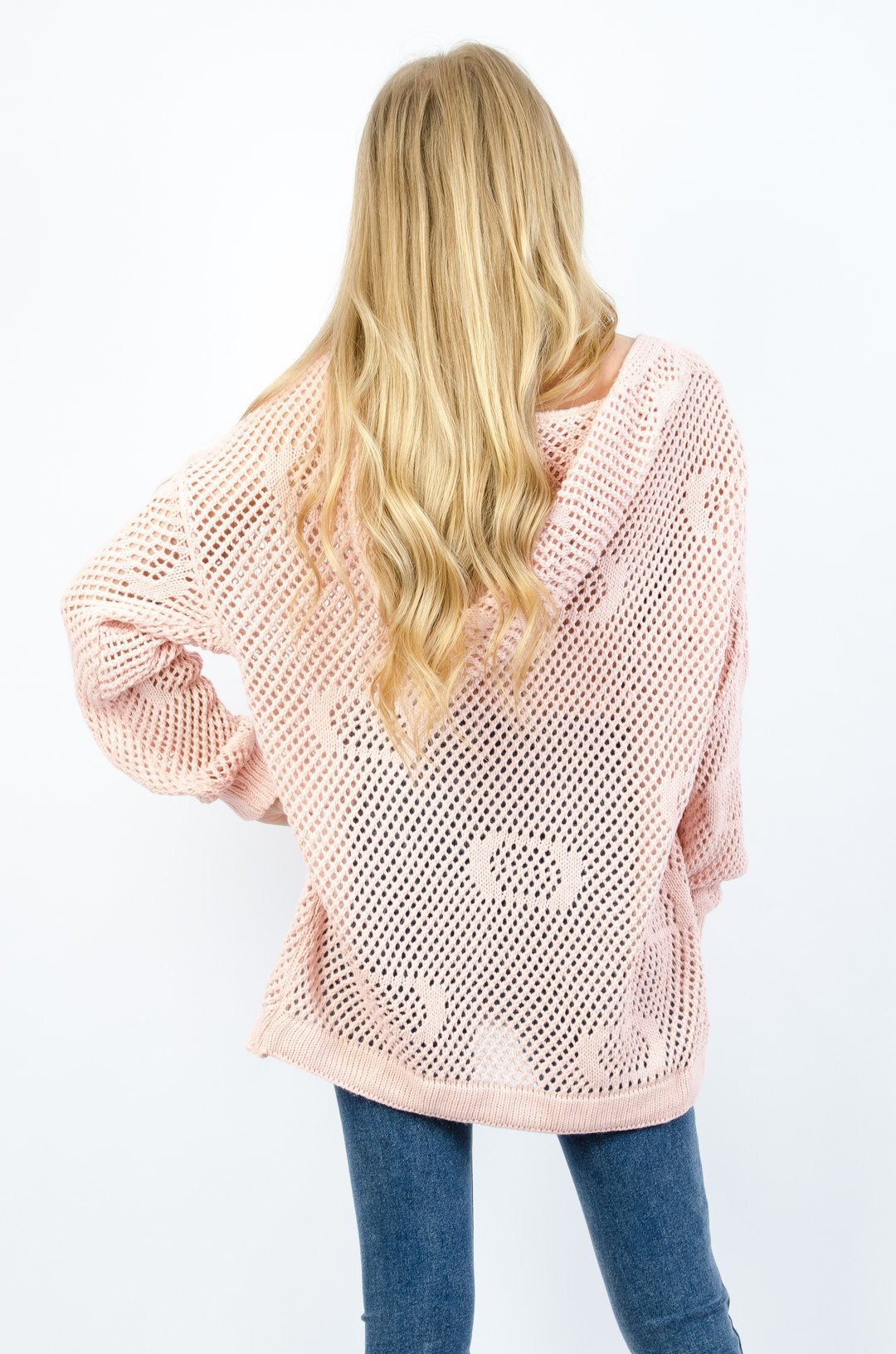 RÓŻOWY AŻUROWY SWETER Z KAPTUREM
