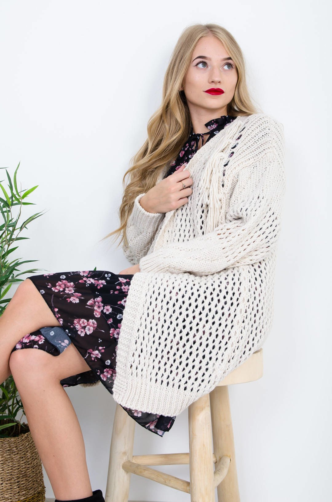 BEŻOWA AŻUROWA NARZUTA Z FRĘDZLAMI