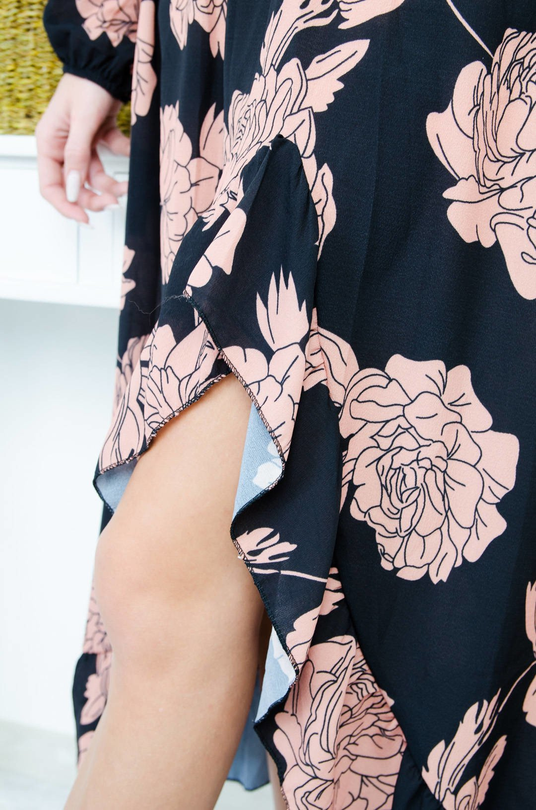 CZARNA ASYMETRYCZNA SUKIENKA W KWIATY Z KOPERTOWYM DEKOLTEM