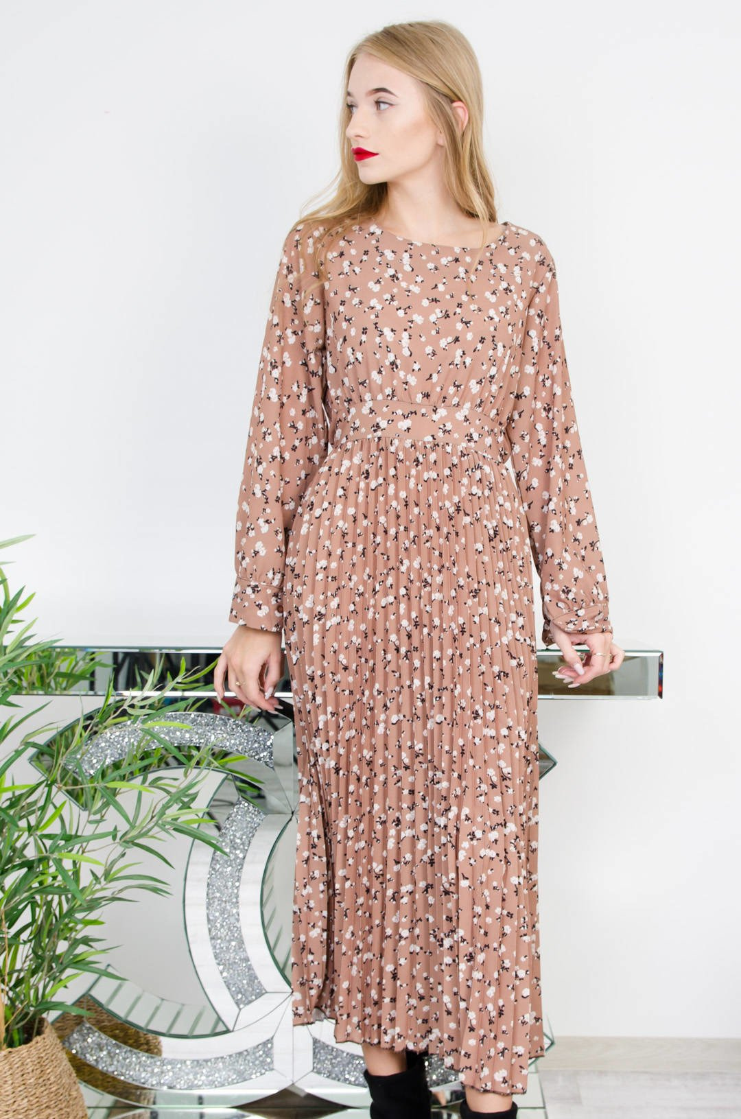 BEŻOWA SUKIENKA W BIAŁE KWIATY Z PLISOWANYM DOŁEM