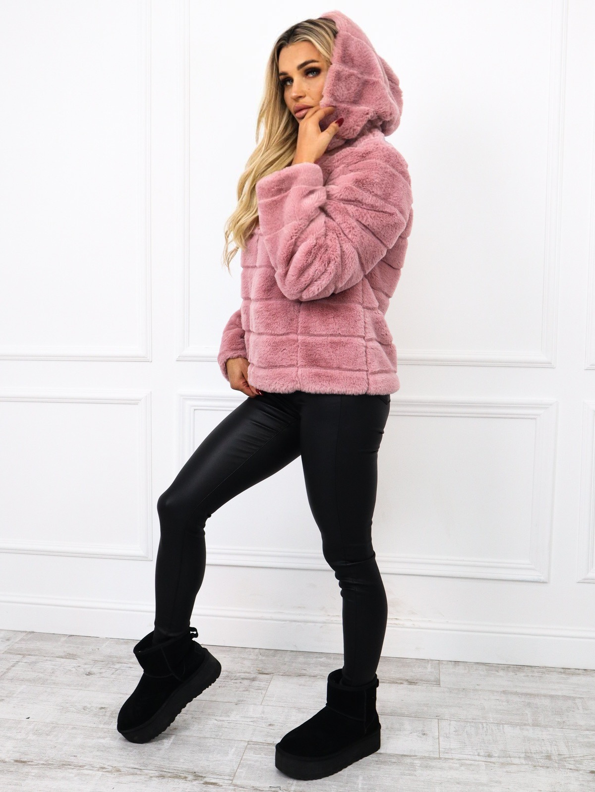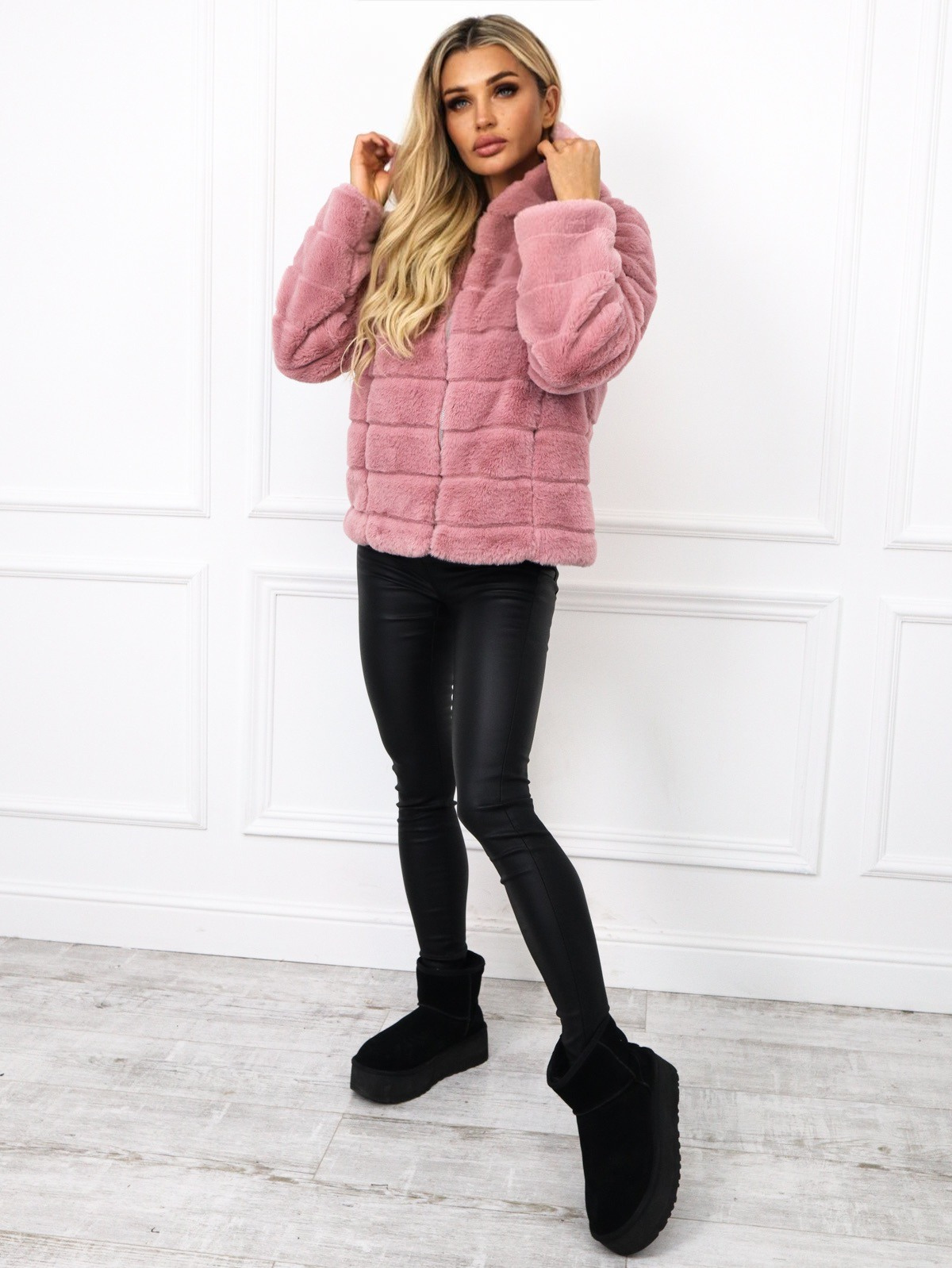 RÓŻOWA FUTRZANA KURTKA Z KAPTUREM