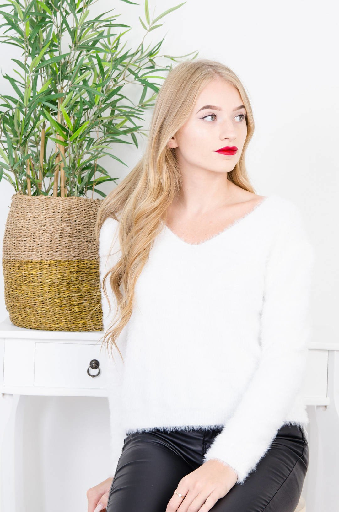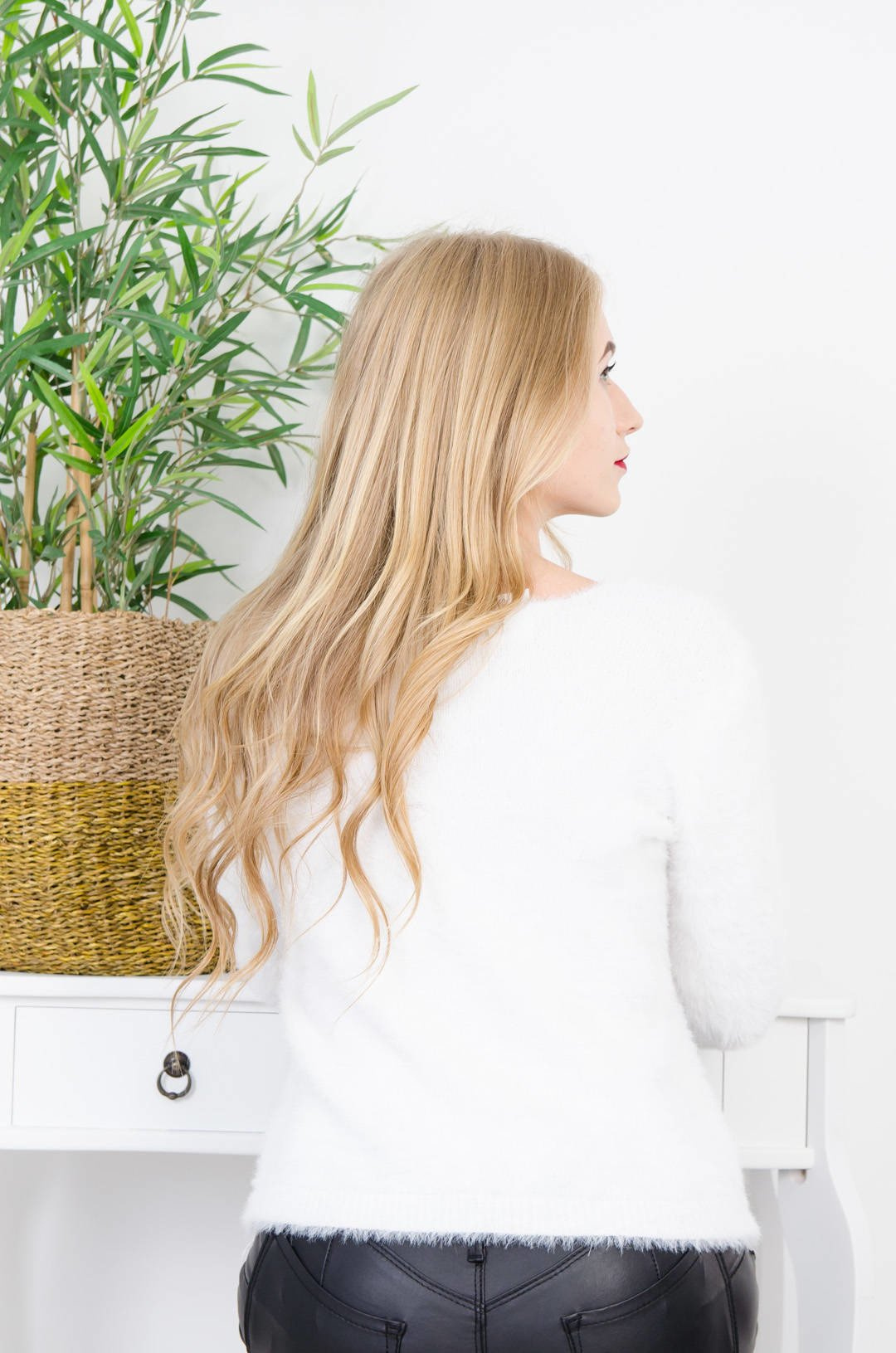BIAŁY WŁOCHATY SWETER Z DEKOLTEM W SEREK