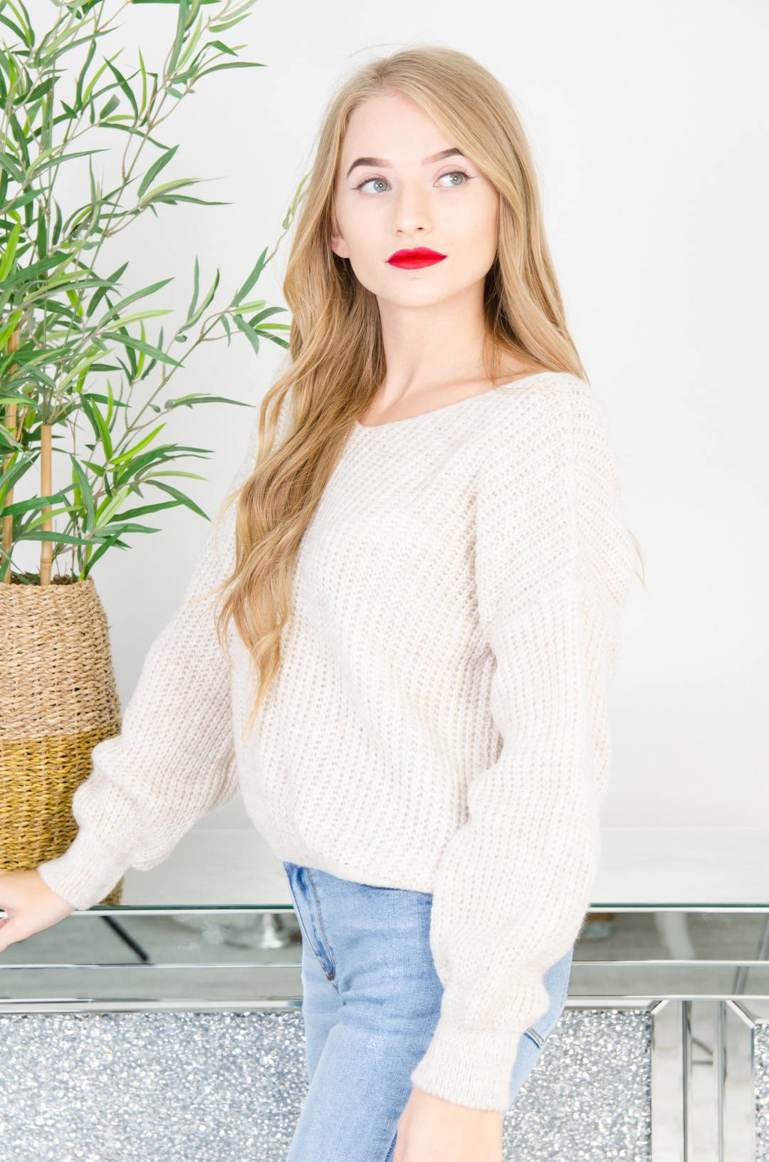 KRÓTKI BEŻOWY SWETER Z DEKOLTEM W SZPIC