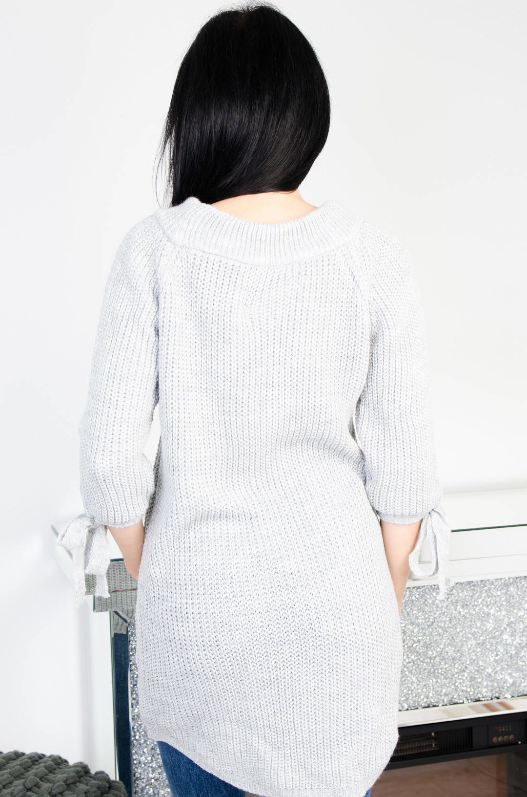 DŁUGI SZARY SWETER-SUKIENKA Z WIĄZANIEM NA RĘKAWACH