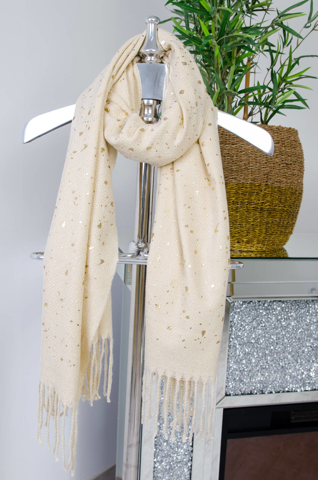 BEŻOWO-ZŁOTY SZAL Z FRĘDZLAMI