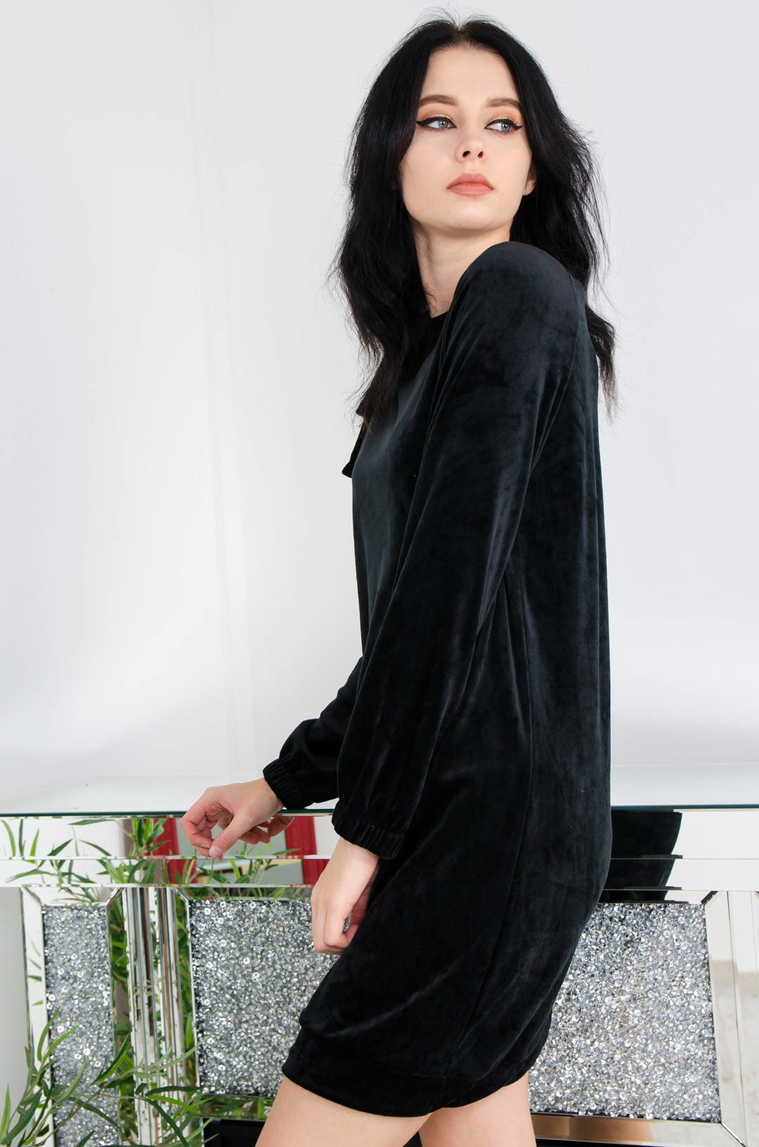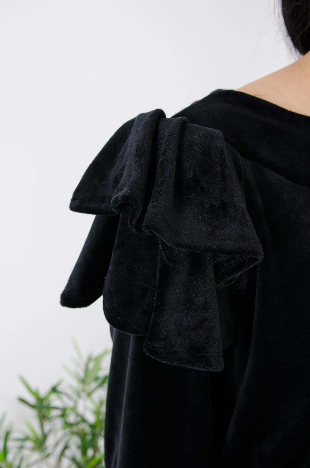 CZARNA WELUROWA SUKIENKA Z FALBANĄ NA RAMIENIU