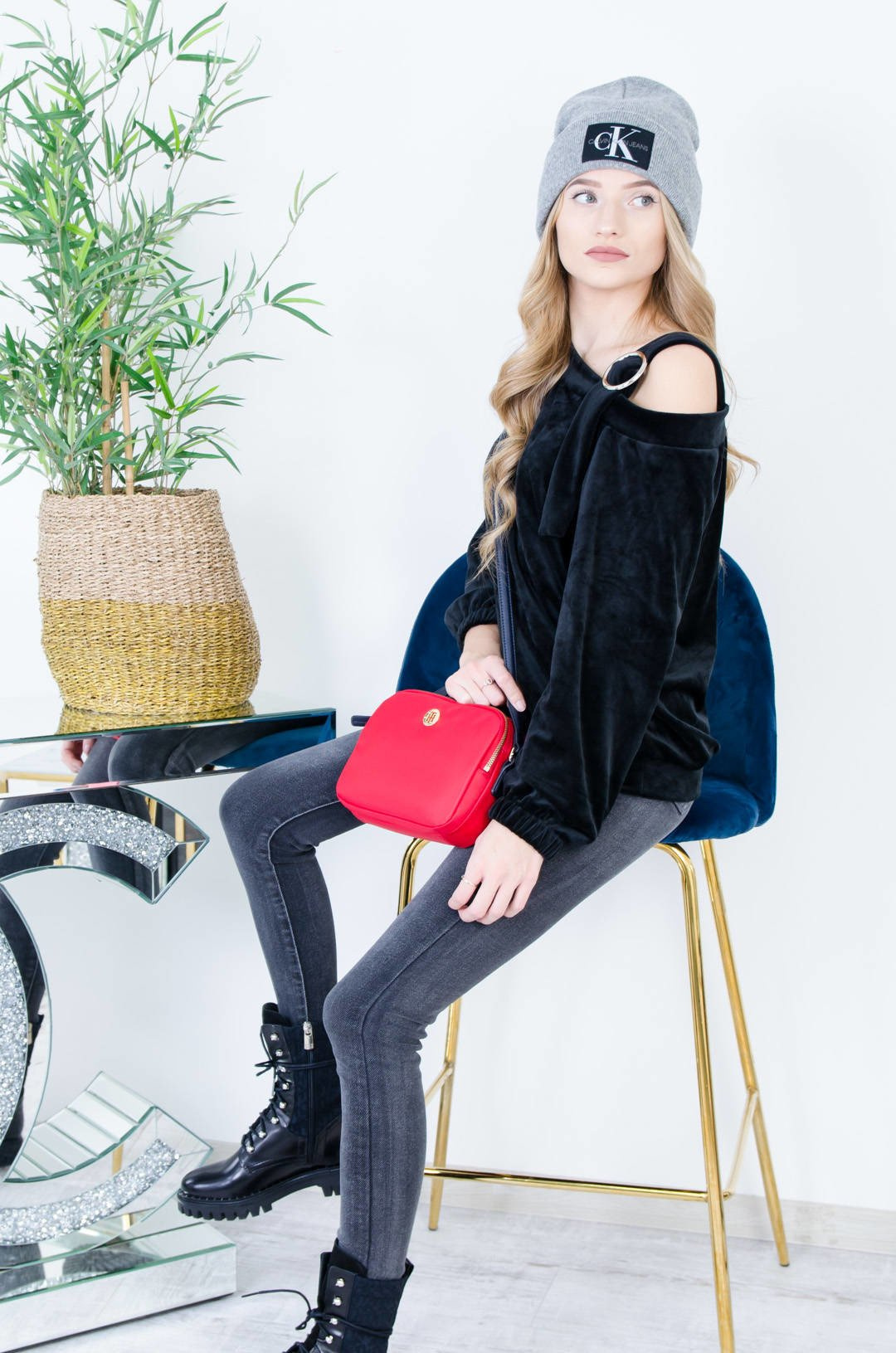 CZARNA WELUROWA BLUZKA Z WYCIĘCIEM NA RAMIENIU