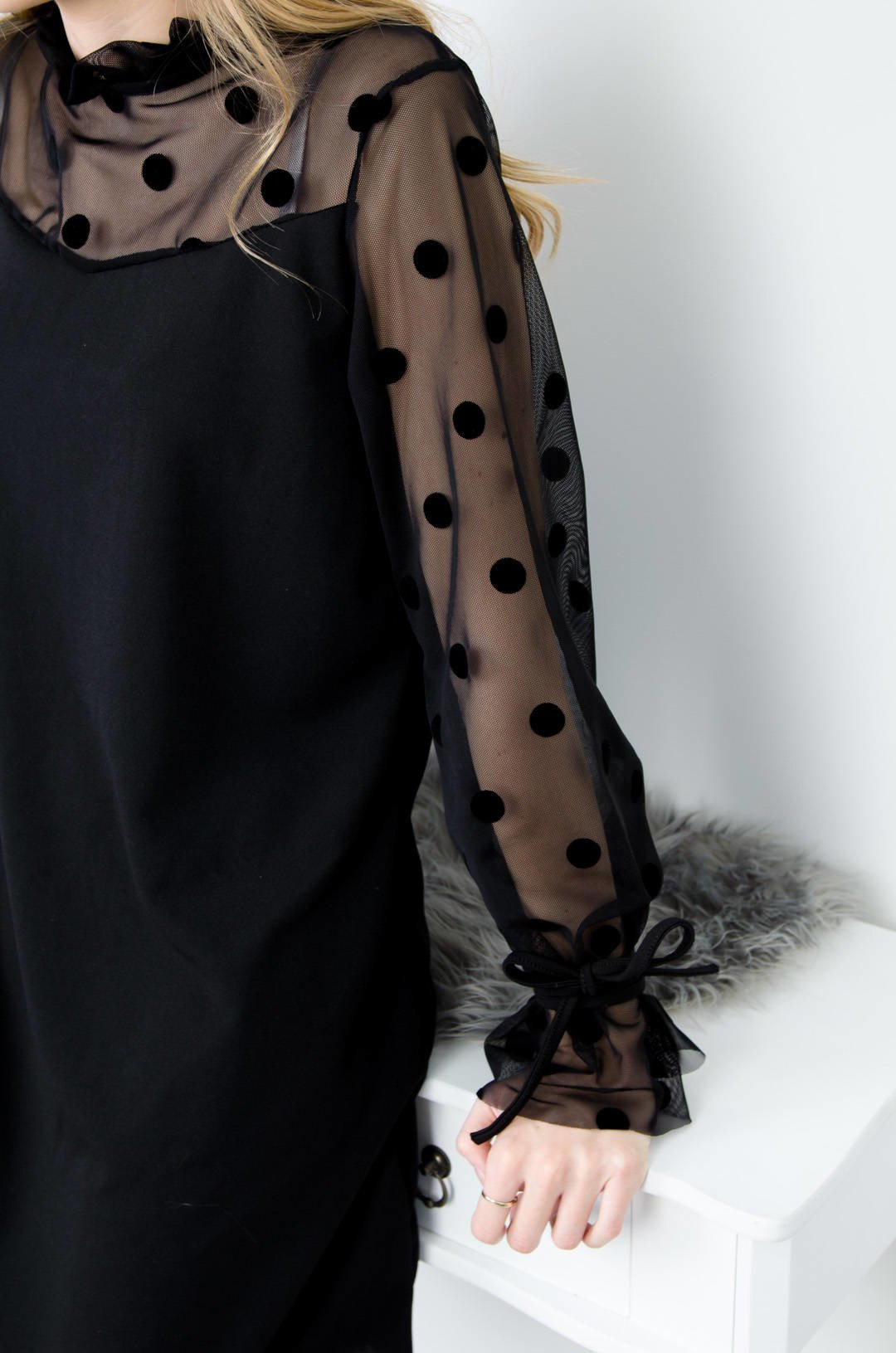 CZARNA SUKIENKA Z TIULOWĄ GÓRĄ I RĘKAWAMI W