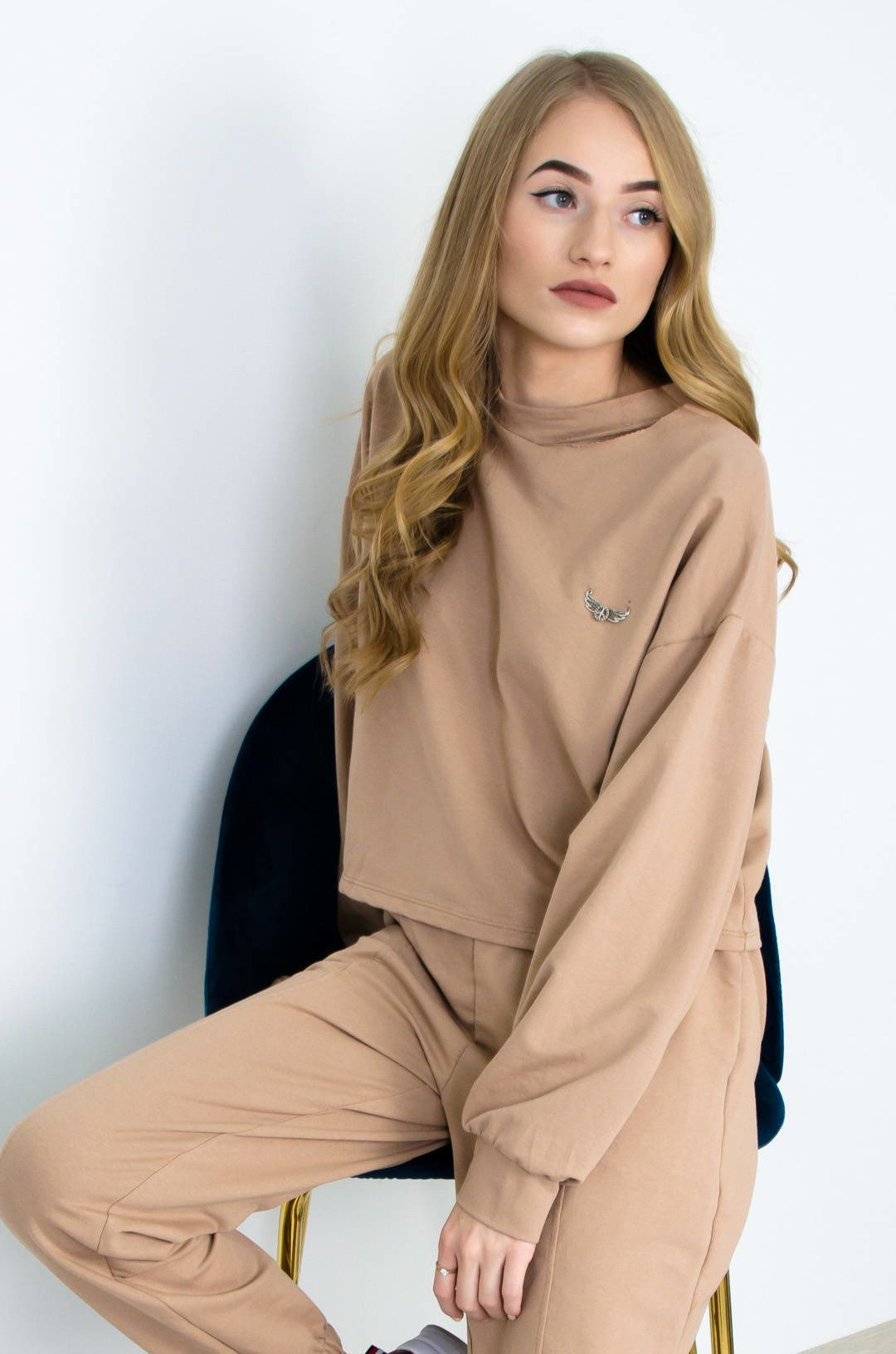 JASNO-BRĄZOWY BAWEŁNIANY KOMPLET DRESOWY Z PRZYPINKĄ
