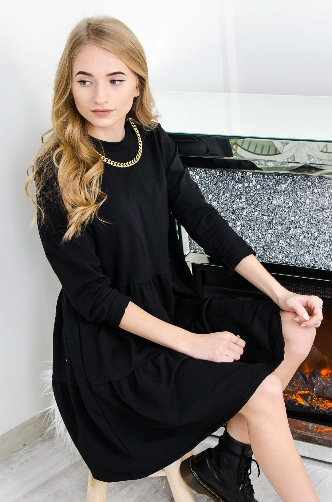 CZARNA ROZKLOSZOWANA SUKIENKA ZE ZŁOTYM ŁAŃCUSZKIEM