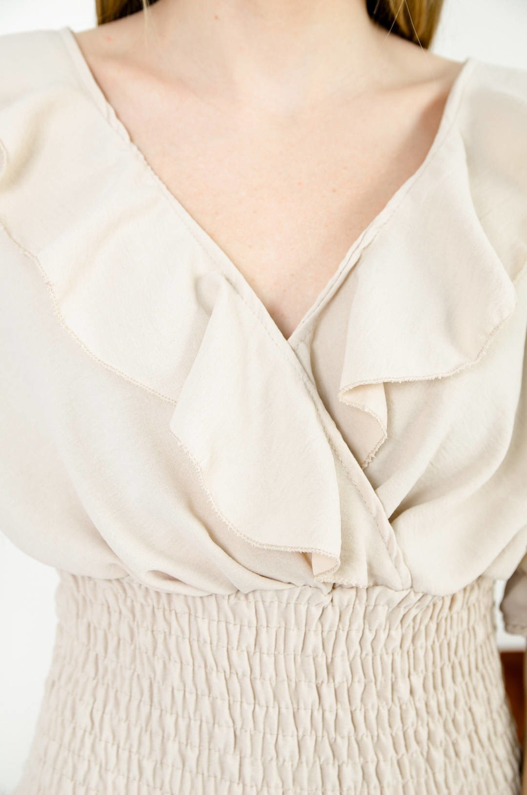 BEŻOWA SUKIENKA Z FALBANAMI I SZEROKIM ŚCIĄGACZEM W PASIE