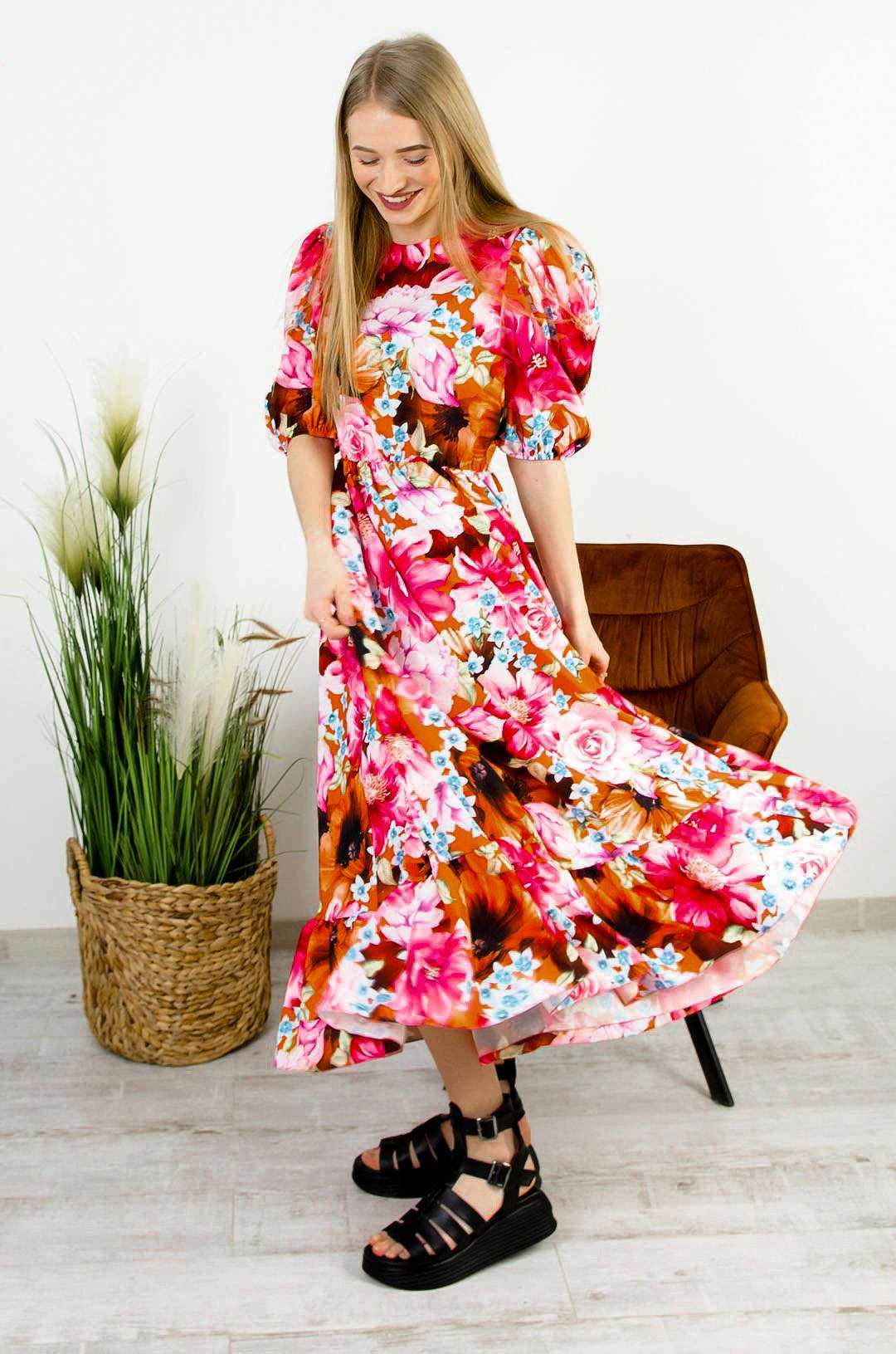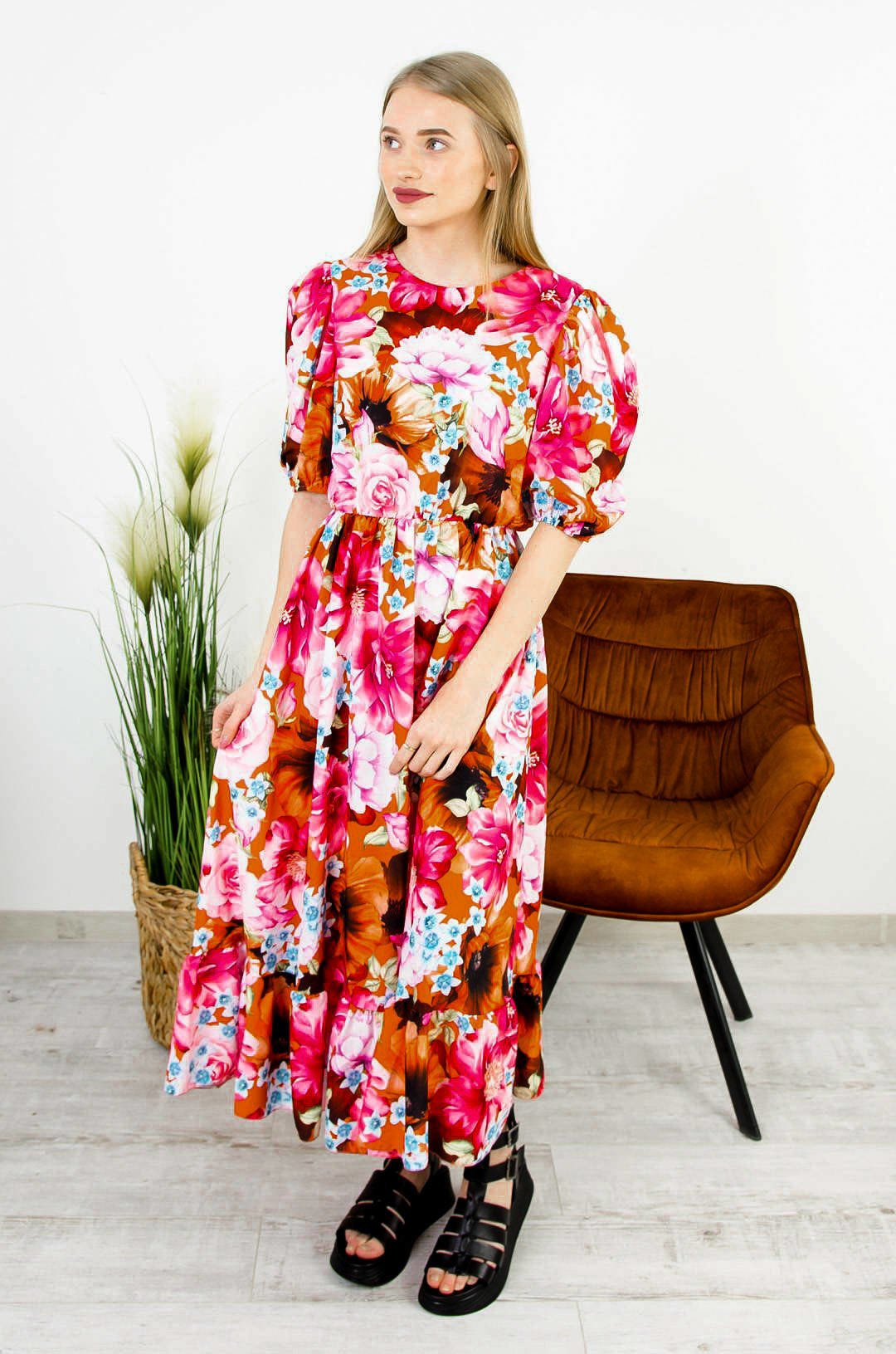 DŁUGA KOLOROWA SUKIENKA Z BUFIASTYMI RĘKAWAMI
