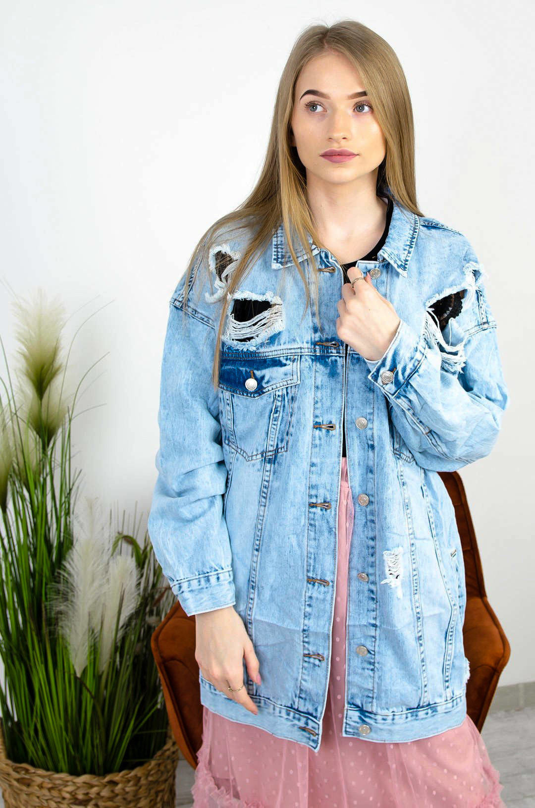 DŁUGA KURTKA JEANSOWA Z PRZETARCIAMI ( DUŻE ROZMIARY M-3XL )