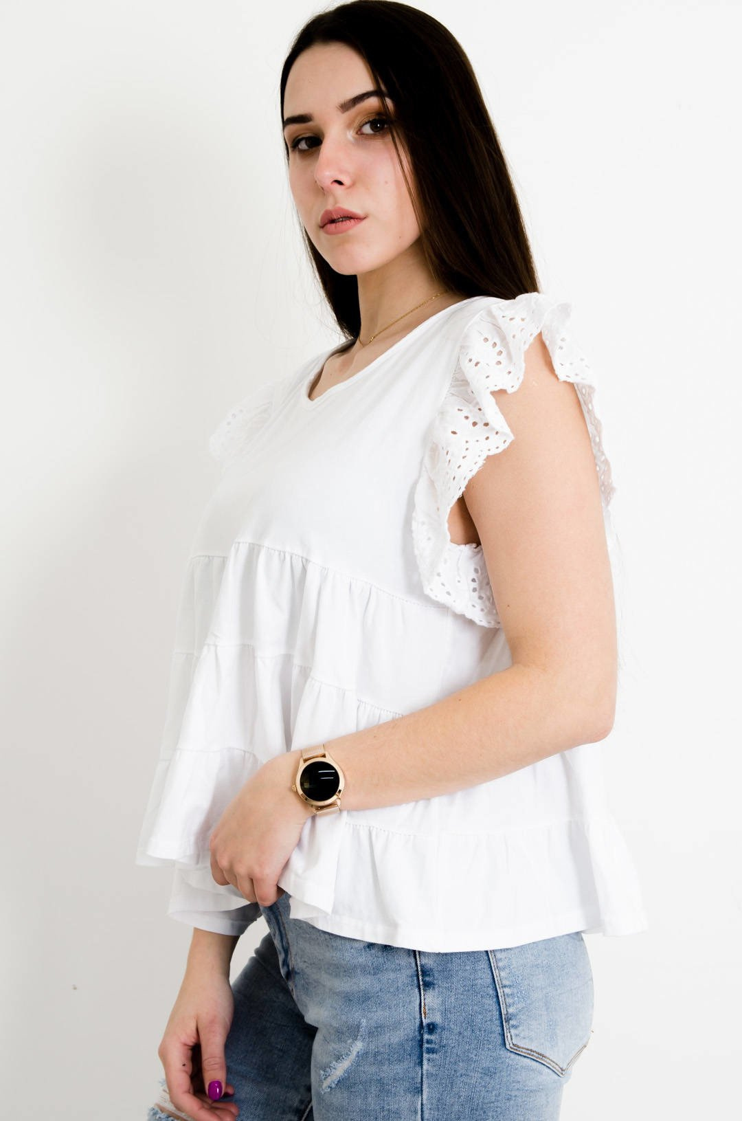 BIAŁA ROZKLOSZOWANA BLUZKA Z AŻUROWYMI RĘKAWAMI