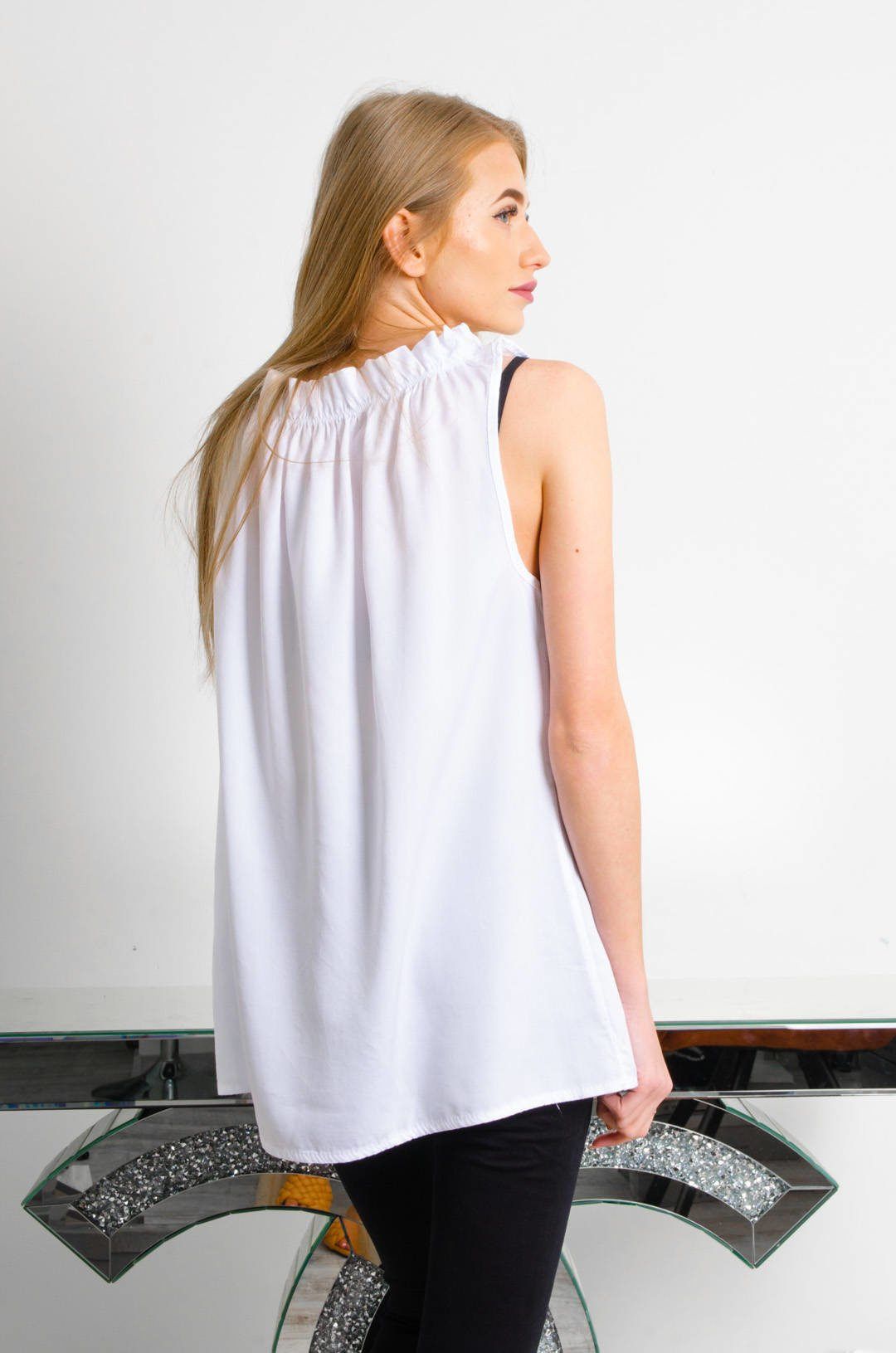 BIAŁA BLUZKA BEZ RĘKAWÓW Z MARSZCZENIEM ORAZ WIĄZANIEM PRZY SZYI