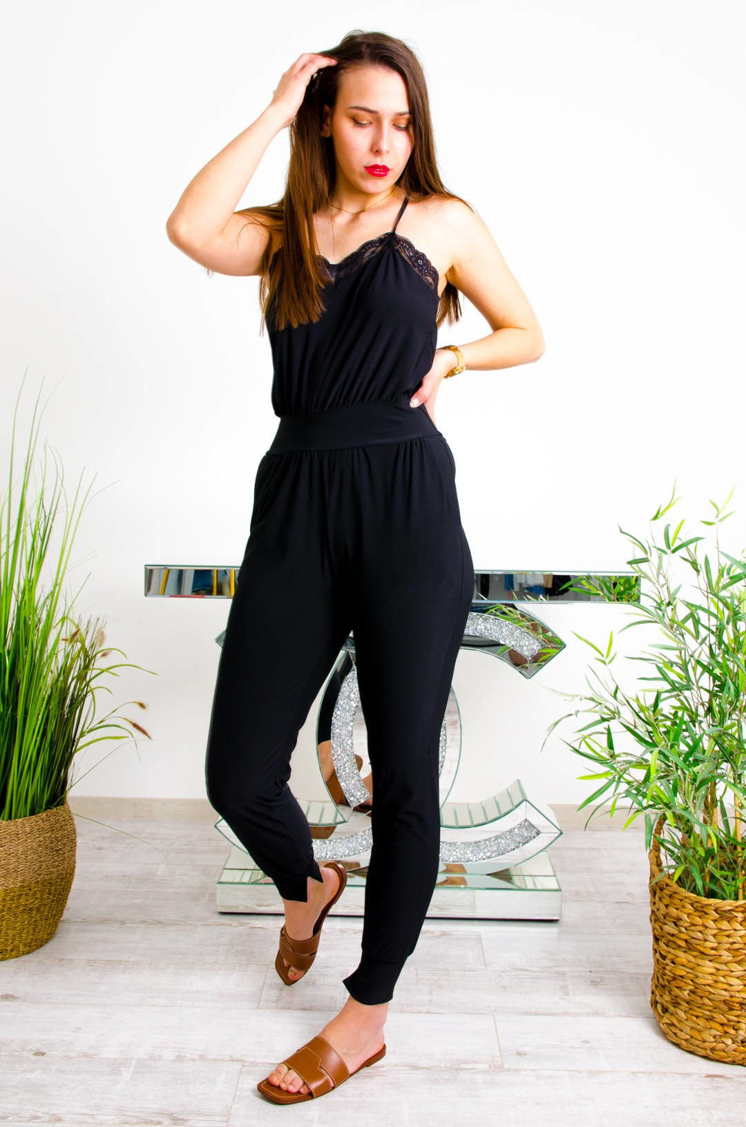 CZARNY DŁUGI KOMBINEZON NA CIENKICH RAMIĄCZKACH