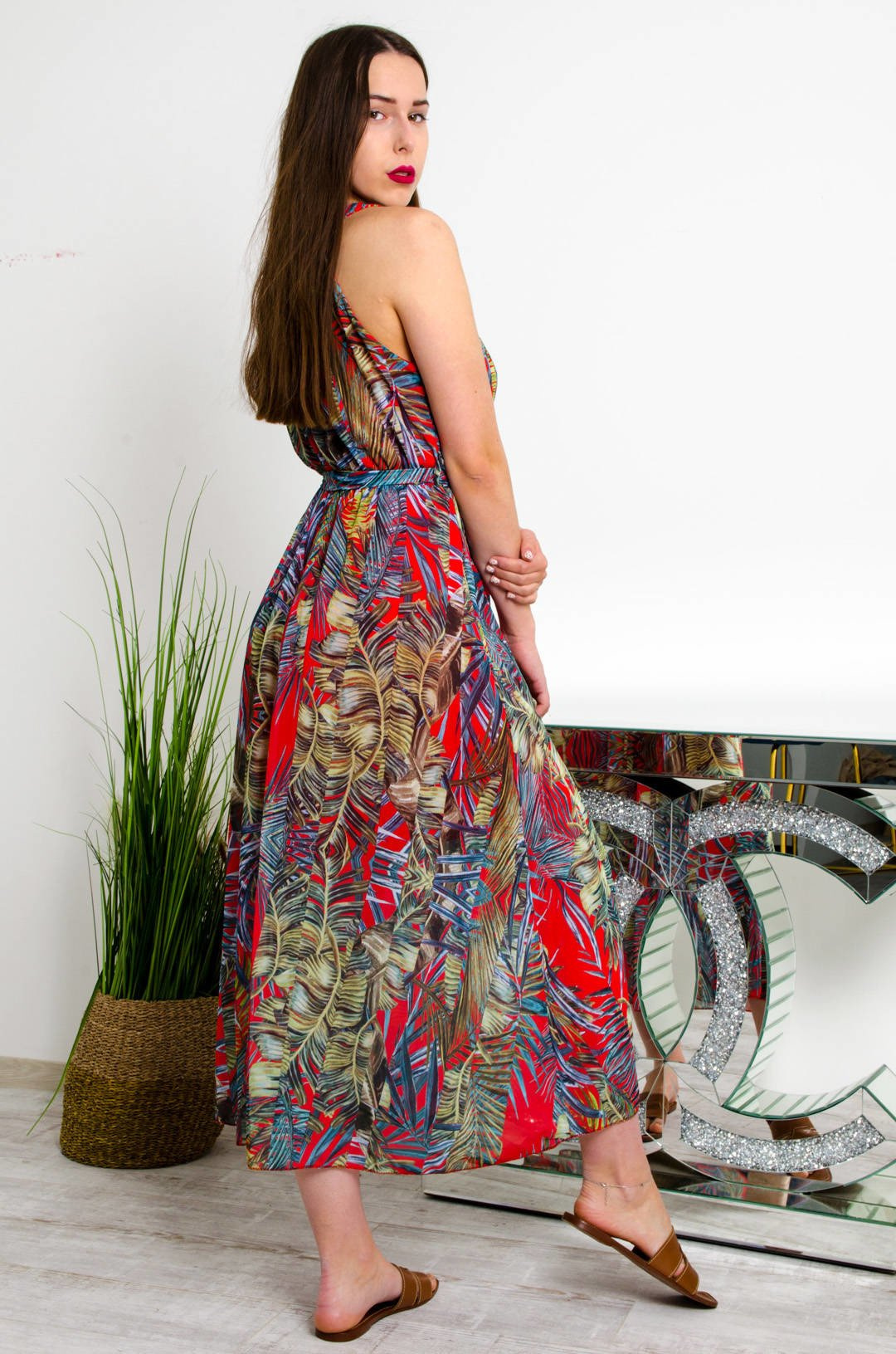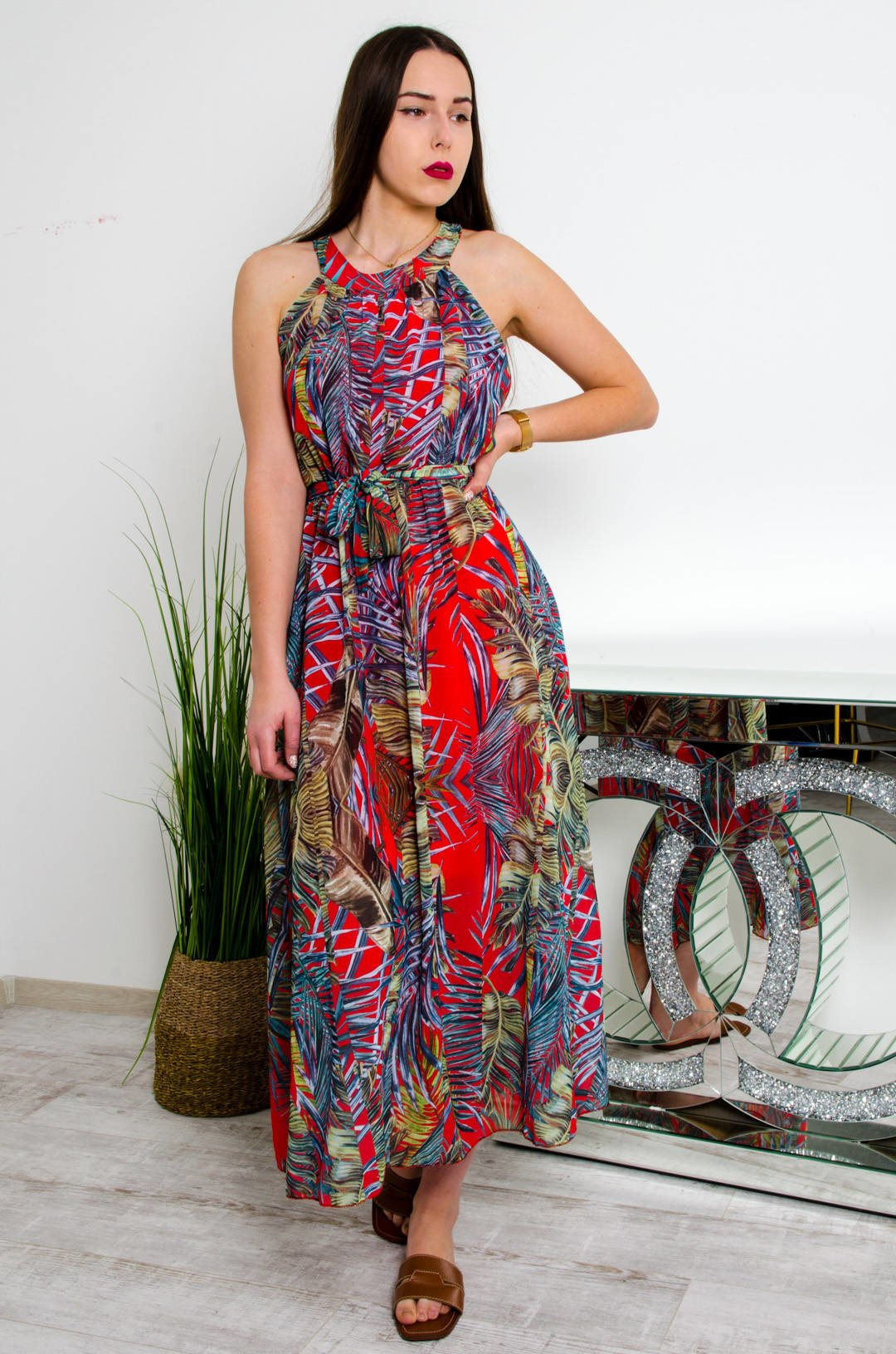 DŁUGA CZERWONO-ZIELONA SUKIENKA MAXI W KWIATOWY WZÓR
