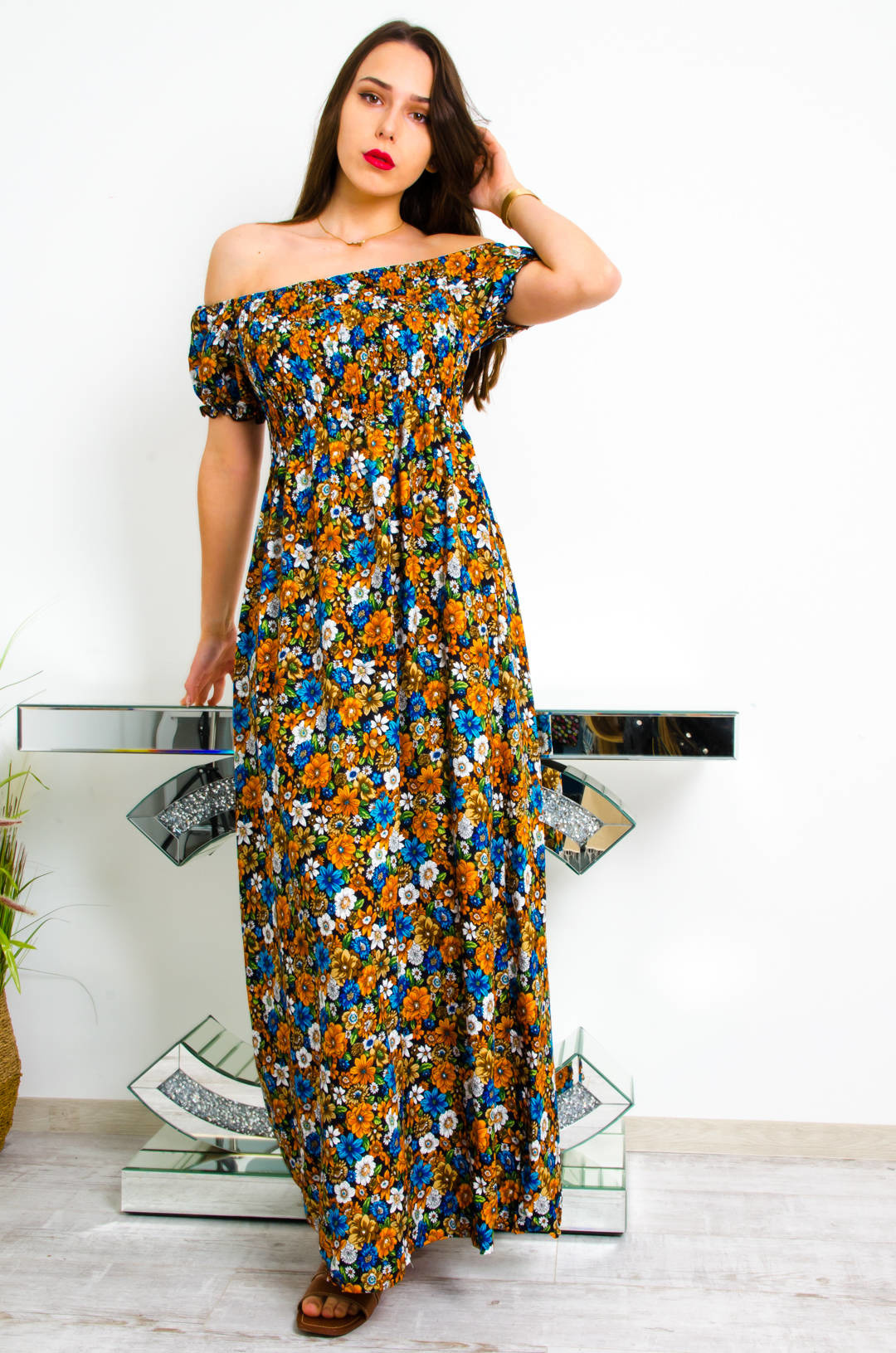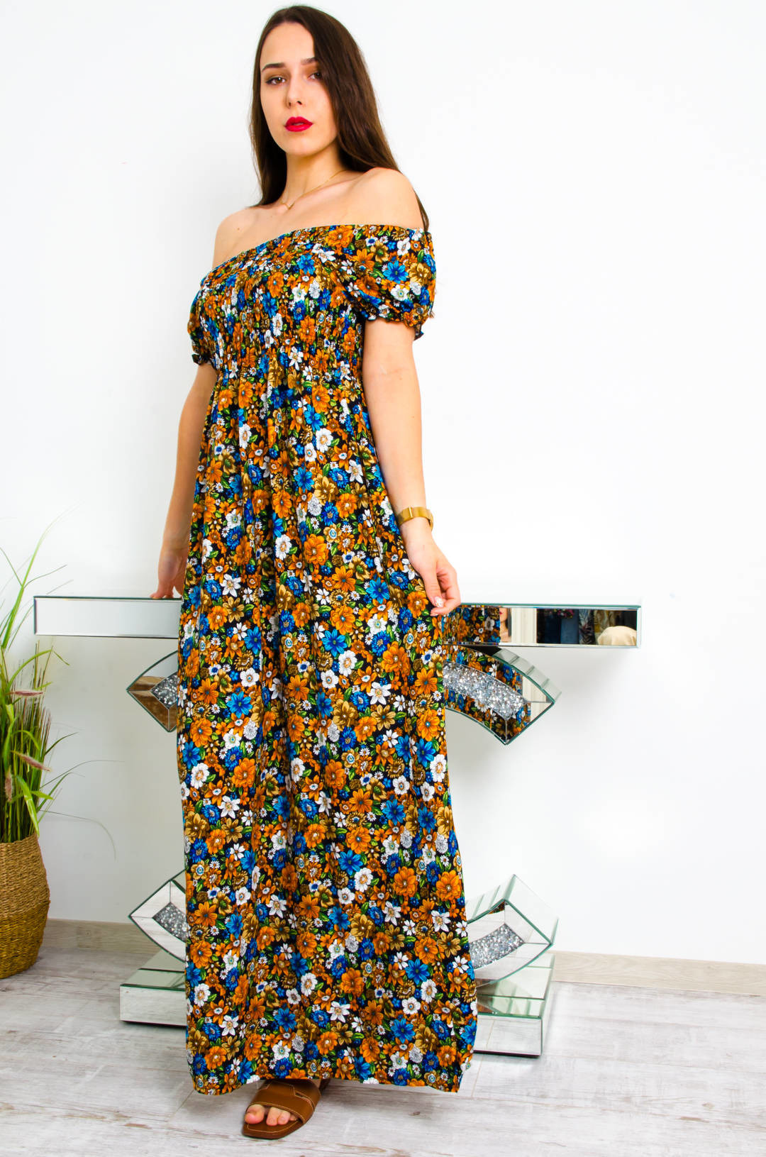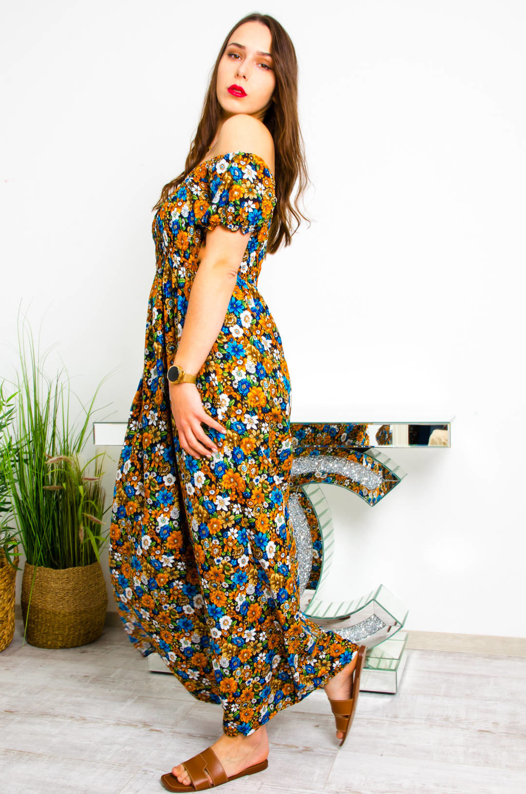 CZARNO-POMARAŃCZOWA DŁUGA SUKIENKA HISZPANKA W KWIATY