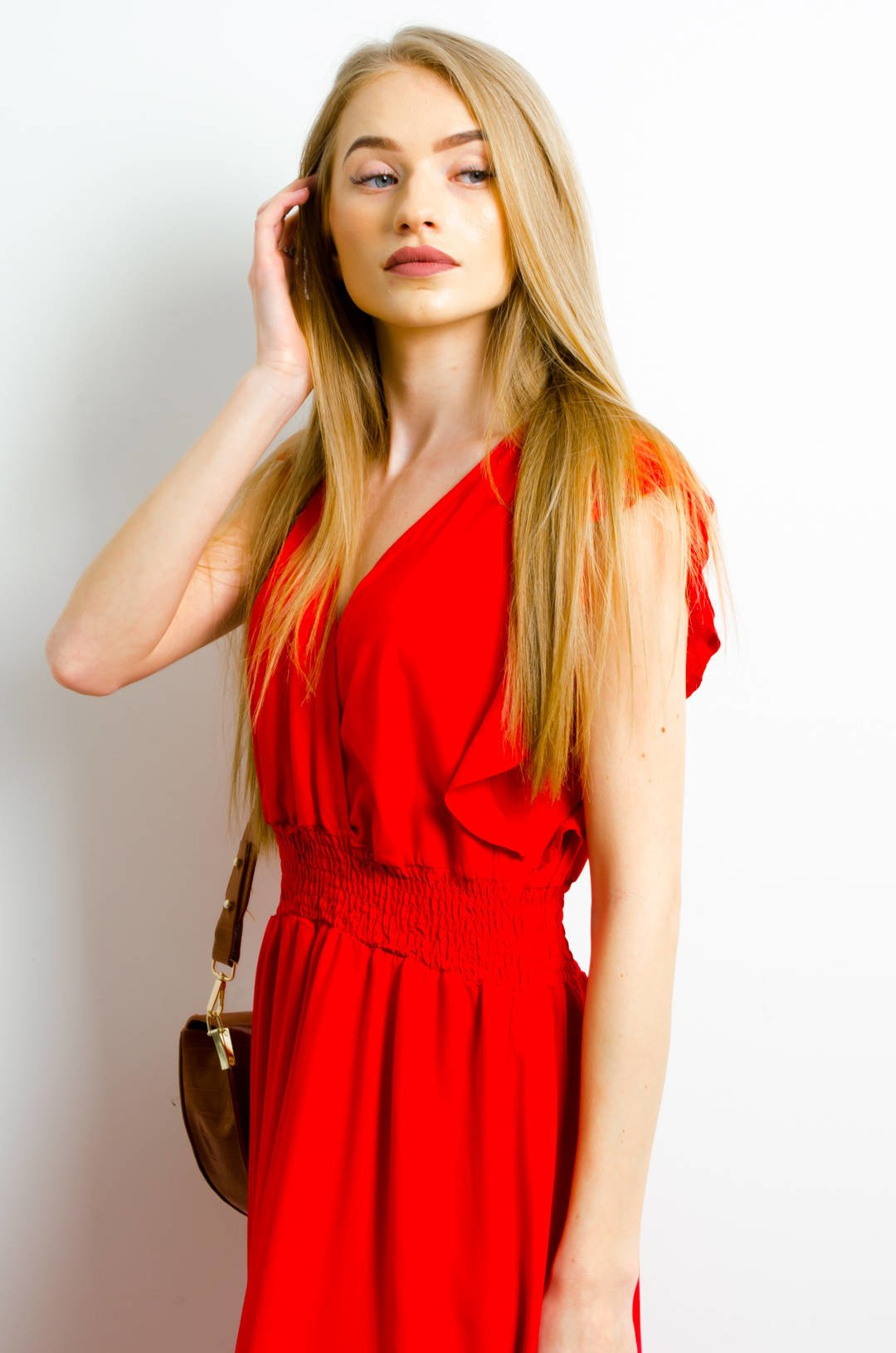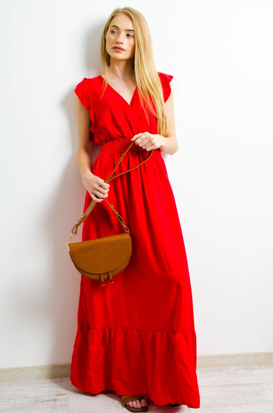DŁUGA CZERWONA SUKIENKA Z KOPERTOWYM DEKOLTEM