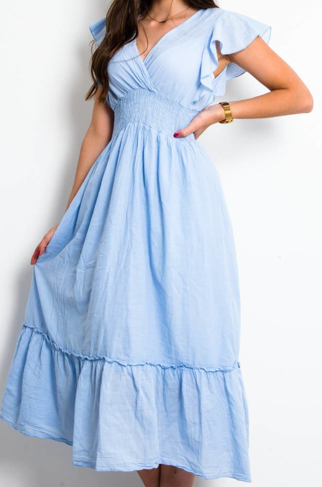 NIEBIESKA DŁUGA MUŚLINOWA SUKIENKA NA ZAKŁĄDKĘ