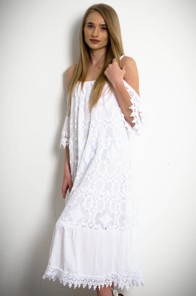 BIAŁA  AŻUROWA SUKIENKA Z ODKRYTYMI RAMIONAMI
