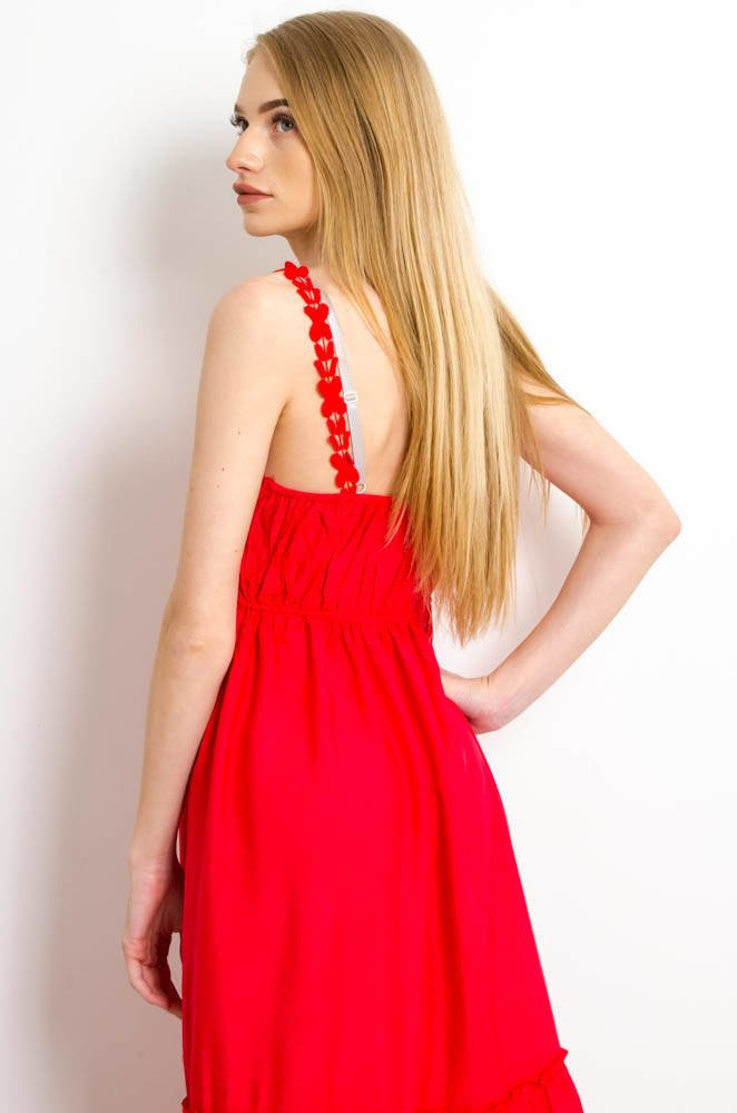 CZERWONA SUKIENKA MAXI NA RAMIĄCZKACH Z AŻUROWĄ GÓRĄ
