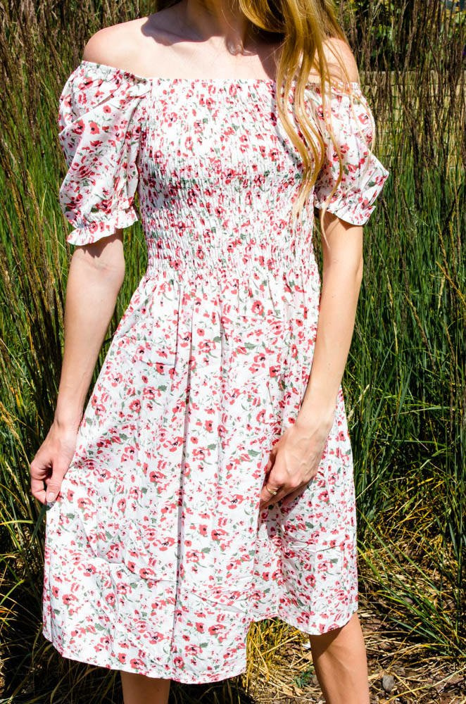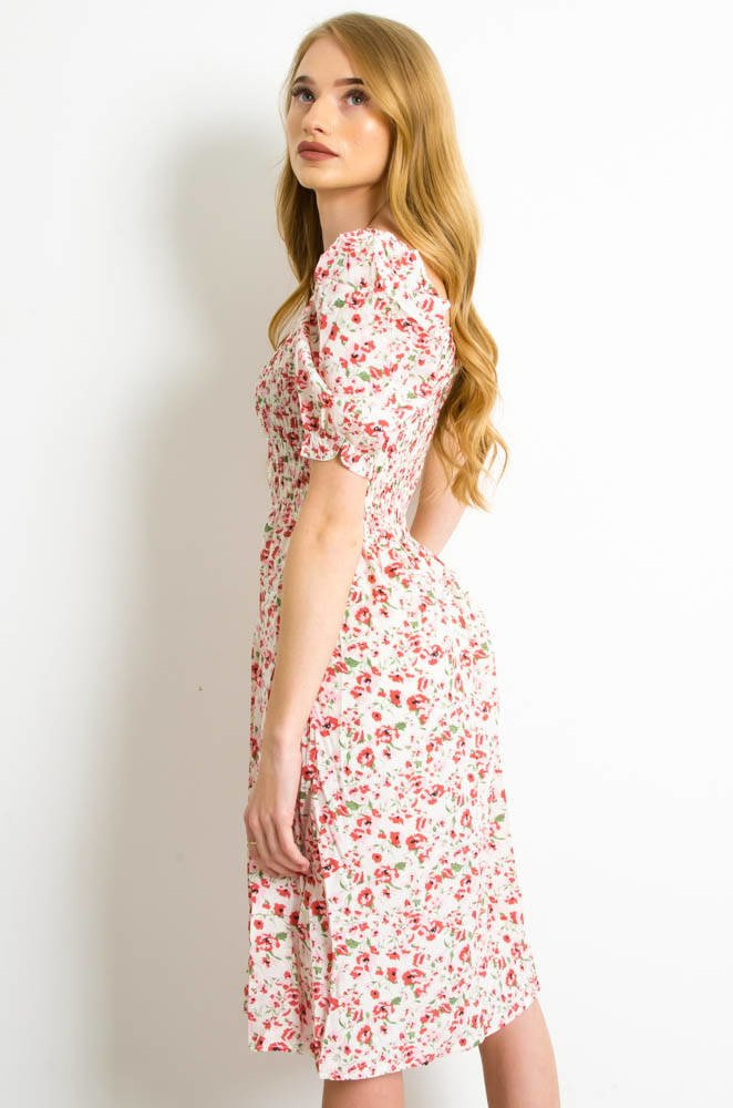 BIAŁA SUKIENKA Z BUFKAMI W RÓŻOWE KWIATY